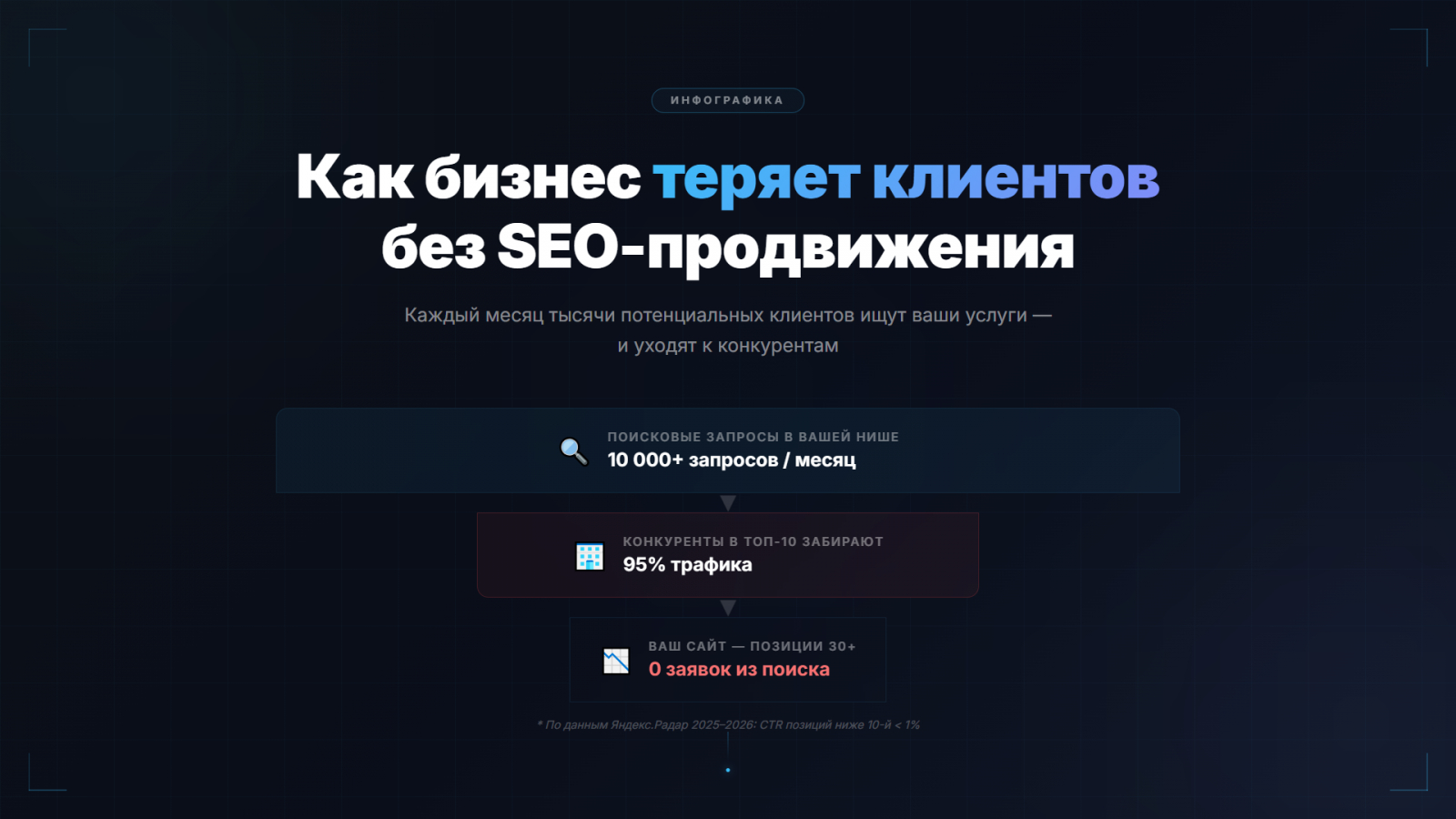 Каждый день без SEO — это клиенты, которые уходят к конкурентам. Не потому что у них лучше продукт. А потому что их проще найти.