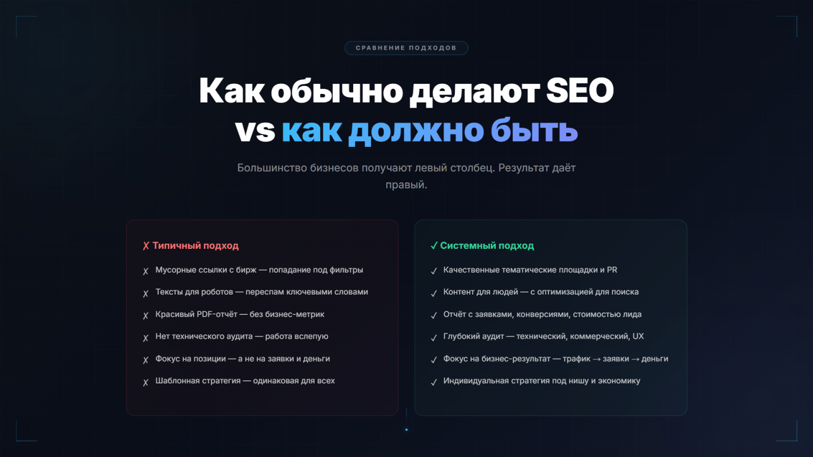 Формула: Аудит + стратегия + техоптимизация + контент + ссылки + аналитика = рост заявок. Уберите любой элемент — и формула сломается.