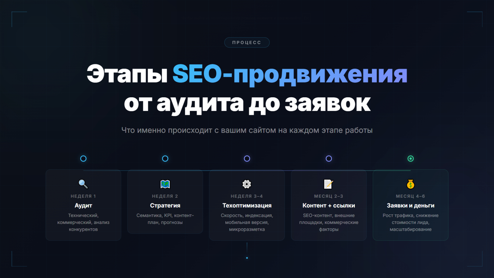 Шаг 3 — Неделя 2: стратегия и предложение. На основе аудита — индивидуальный план: какие запросы продвигать, какие страницы оптимизировать, какой бюджет нужен, какие прогнозы по заявкам. Продвижение сайта в яндексе цена и сроки — конкретно для вашего случая.