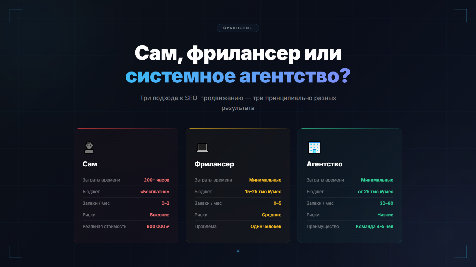 Потрачено: примерно 200 часов личного времени. Результат: +50 визитов в месяц, 2 заявки. При ставке владельца 3 000 ₽/час его «бесплатное SEO» обошлось в 600 000 ₽ упущенного дохода.