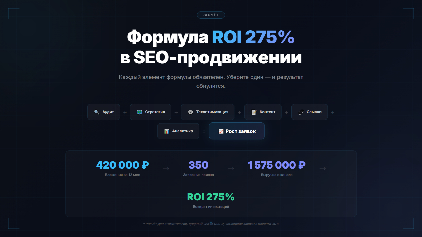 Стоматологическая клиника из Екатеринбурга. Два врача, свежее оборудование, отличные отзывы. Владелец заплатил фрилансеру 280 000 ₽ за 8 месяцев «SEO-продвижения». Результат — 11 заявок. За всё время. Одиннадцать.