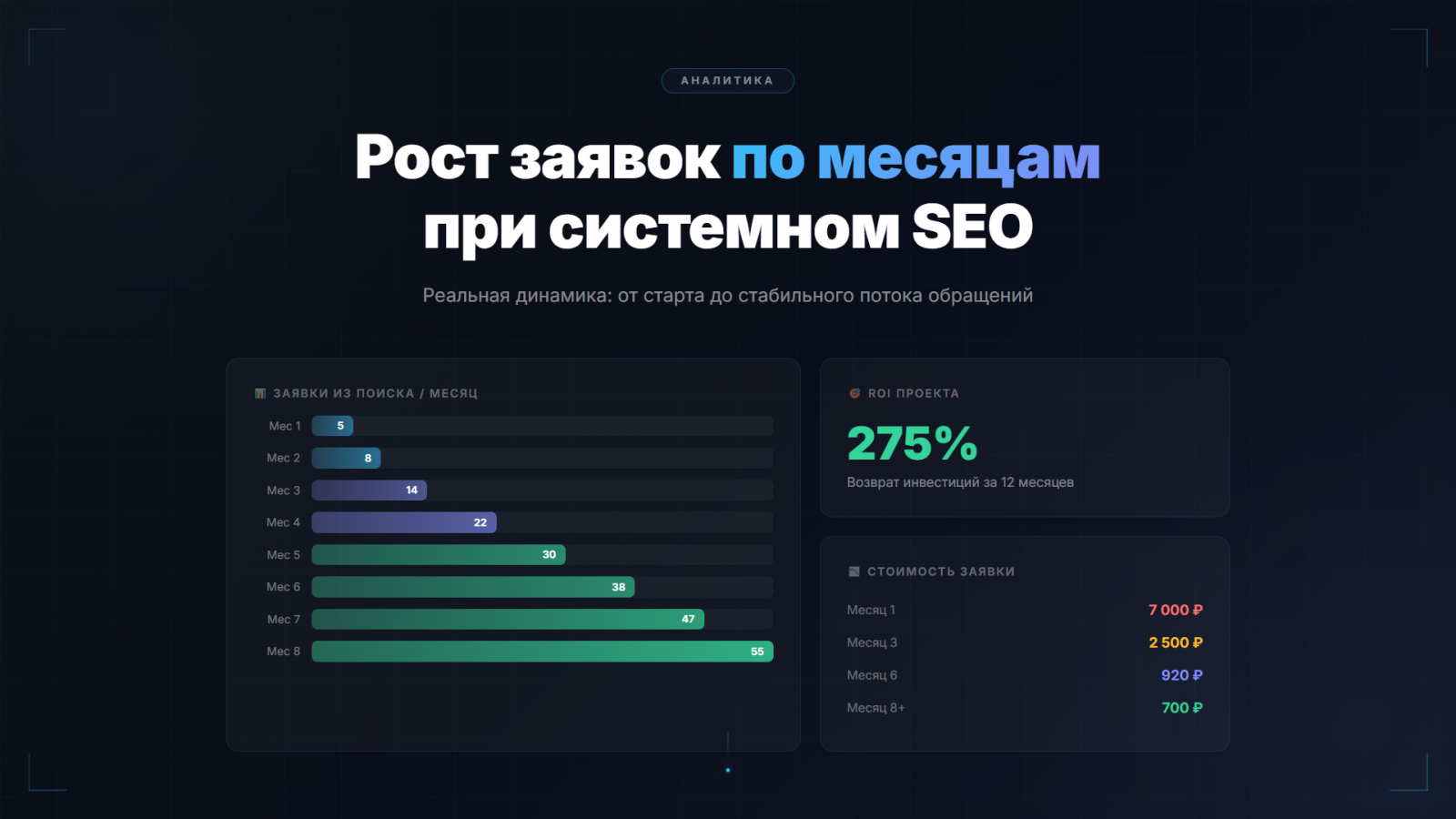 Первый месяц — полноценный аудит и стратегия. Третий месяц — первые заявки из поиска. Шестой месяц — 40 заявок в месяц, стоимость лида 1 200 ₽ при среднем чеке 45 000 ₽. За год — окупаемость вложений в 4 раза.