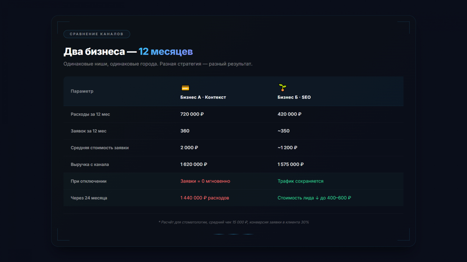 Давайте без иллюзий: первые 2–3 месяца SEO проигрывает контексту по количеству заявок. Это факт. Но с 4-го месяца включается обратный эффект. А через год стоимость заявки из SEO дешевле контекста в 2–3 раза — и продолжает снижаться.