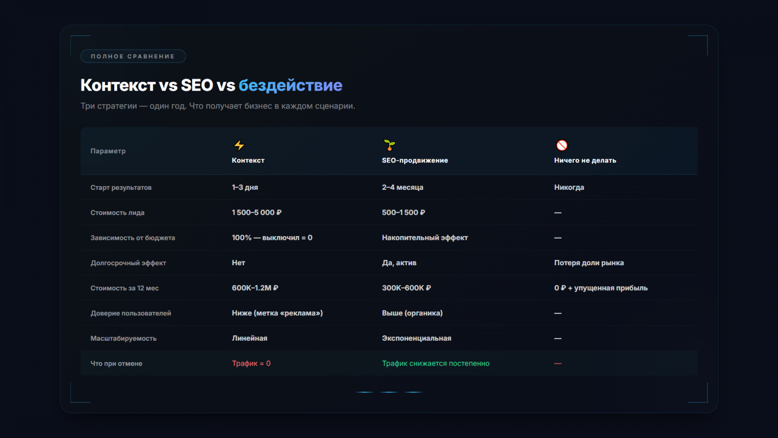 Оптимальный сценарий: запустить контекст и SEO параллельно. Контекст даёт заявки с первых дней, пока SEO набирает обороты. С 4-го месяца органика начинает работать — можно постепенно сокращать расходы на контекст.