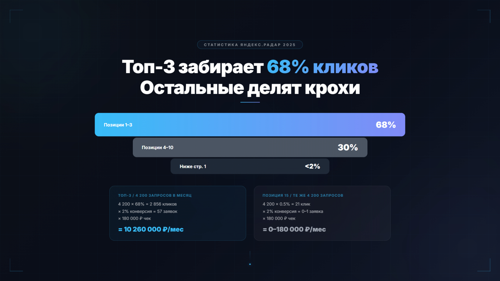 Факт 1. Топ-3 результата в Яндексе получают 68% всех кликов по запросу. Позиции 4–10 делят оставшиеся 30%. Всё, что ниже первой страницы — менее 2% суммарно. Источник: данные Яндекс.Радар, 2025.