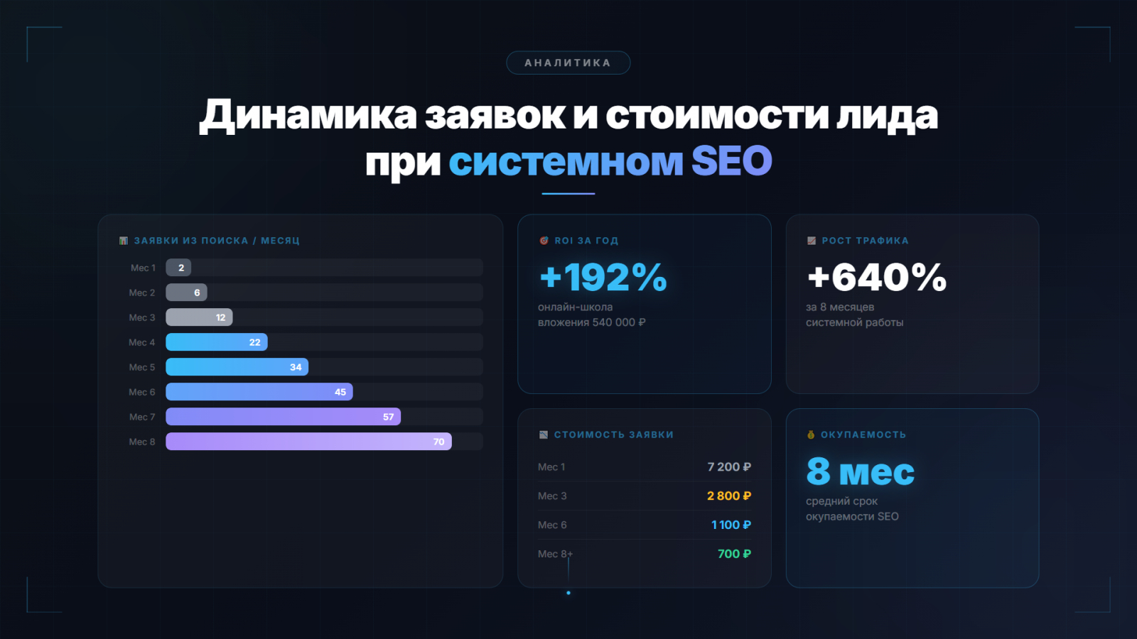 Факт 2. Средняя стоимость лида из органического поиска через 6 месяцев после старта SEO — в 2.4–3.8 раза ниже стоимости лида из контекстной рекламы в той же нише. Это данные по российскому рынку в нишах услуг и e-commerce.