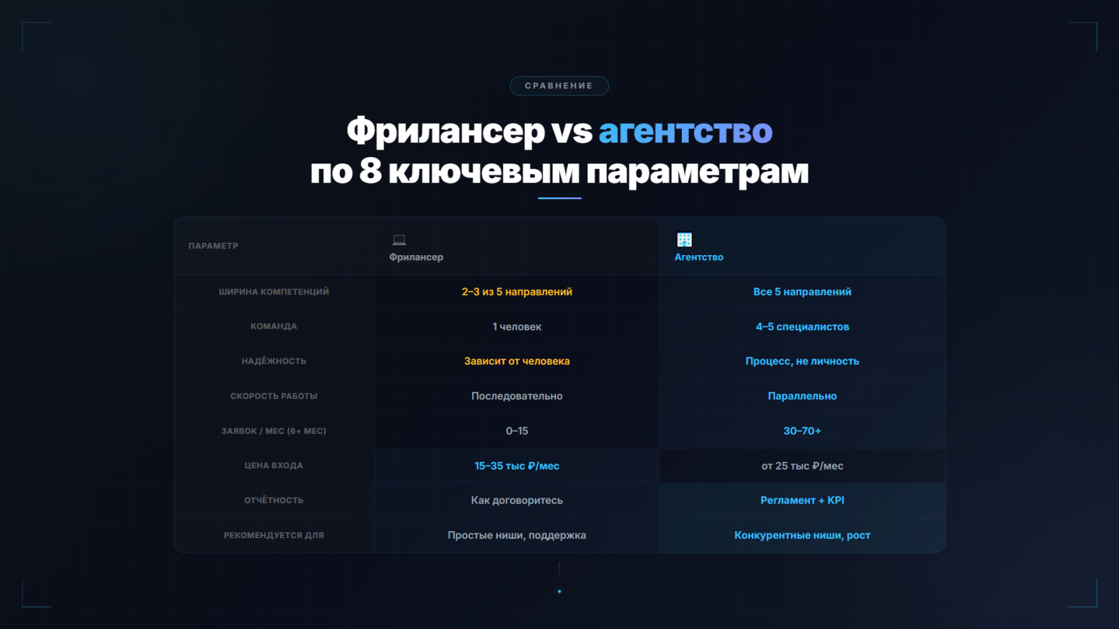 Фрилансер — 15 000–35 000 ₽/мес. Агентство — от 25 000 ₽/мес. Разница меньше, чем кажется, при сравнении реального охвата работ.