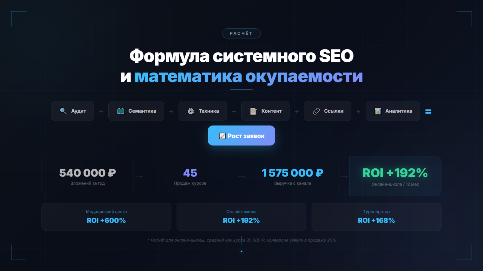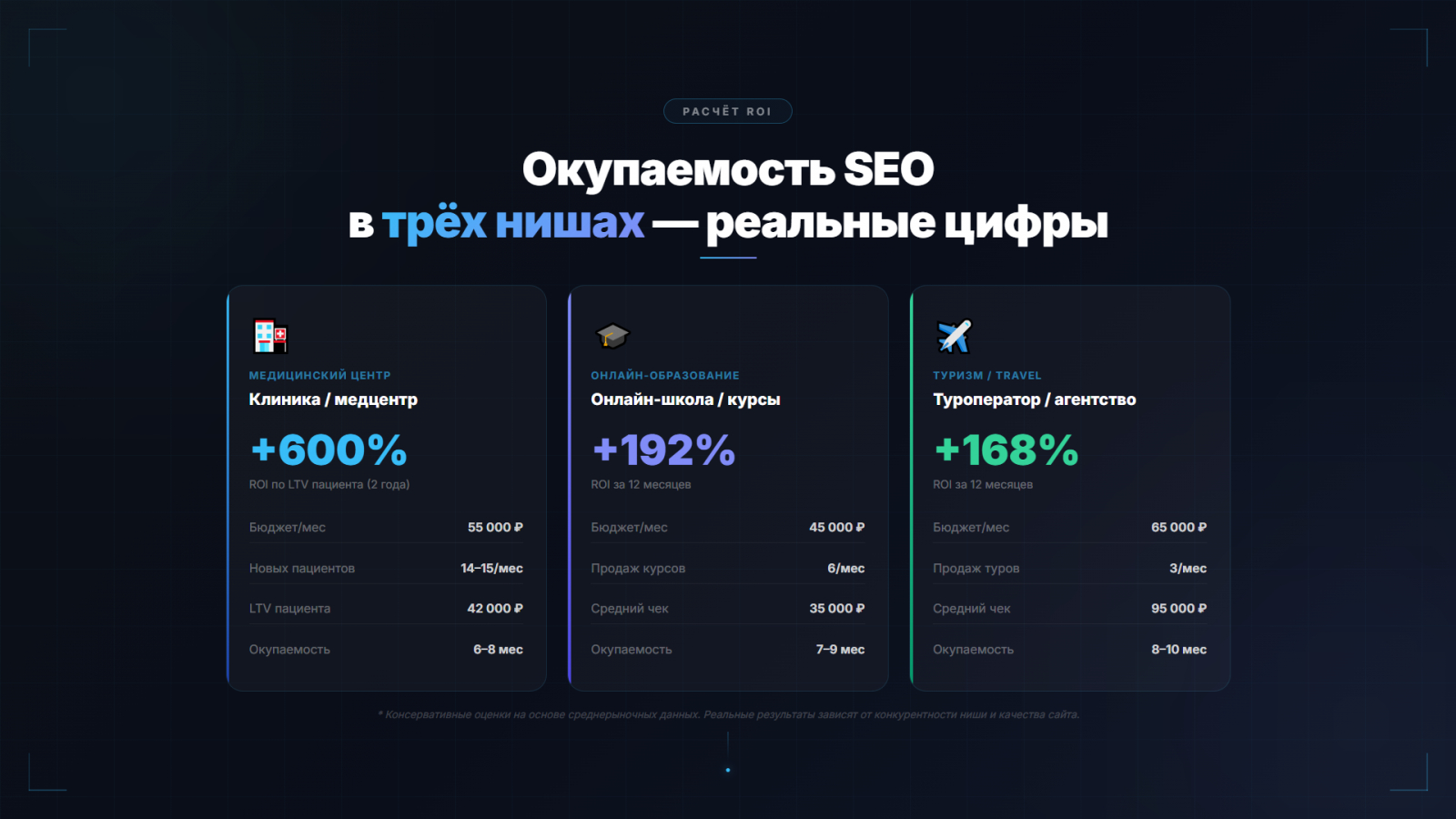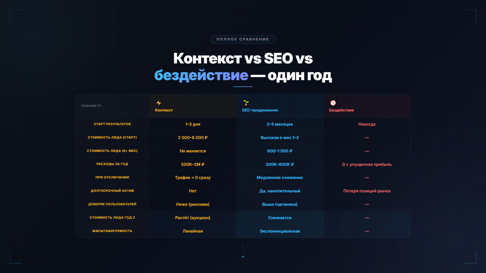 Окей, раскладываю главное: в любом из трёх сценариев SEO окупается в течение 12 месяцев. При этом актив продолжает работать на 2-й и 3-й год — при снижающейся стоимости лида. Это принципиальное отличие от контекстной рекламы, где стоимость лида растёт из года в год вместе с аукционом.