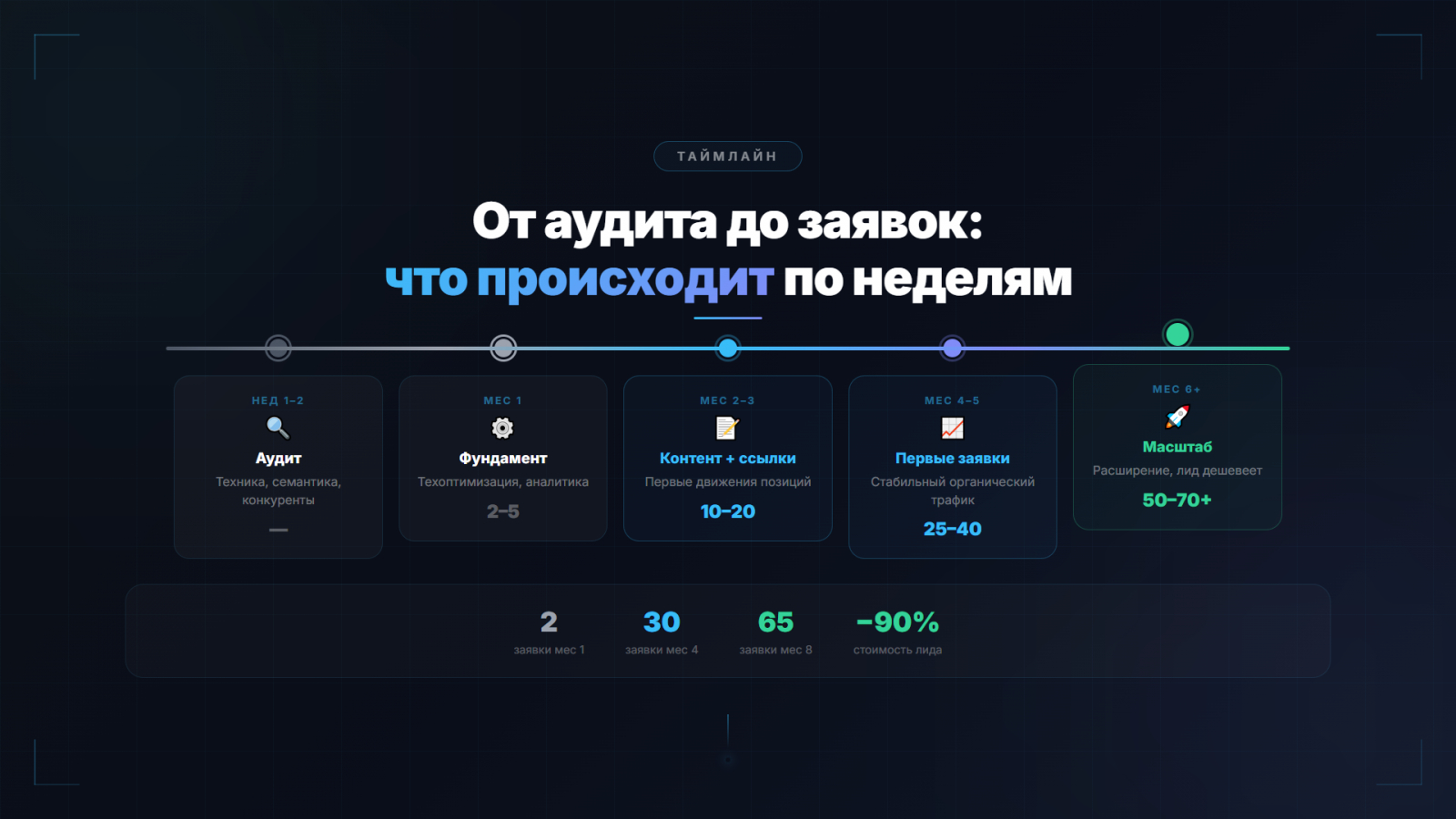 Неделя 3–4: стратегия. На основе аудита — план работ на 6 месяцев: семантическое ядро, структура сайта, контент-план, ссылочная стратегия, KPI по месяцам. Прогноз трафика и заявок с разбивкой по периодам.