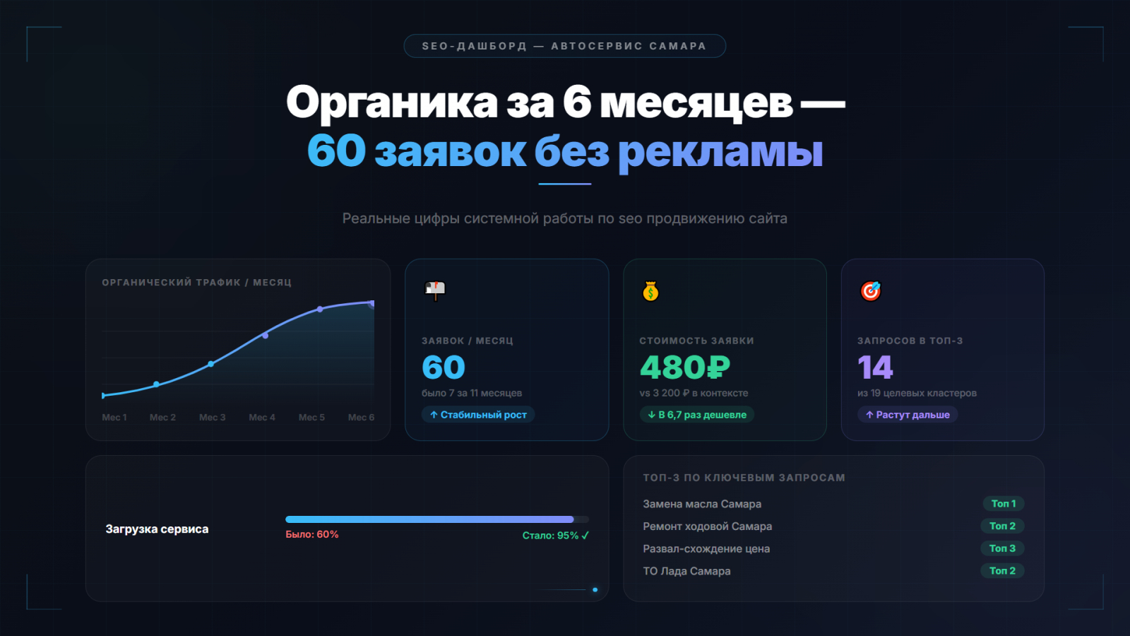 Дальше я расскажу, что именно шло не так, как это исправили, и как через шесть месяцев сервис вышел на 60 заявок в месяц из органического поиска. Без контекстной рекламы, без дополнительных вложений в продвижение сайта услуг.