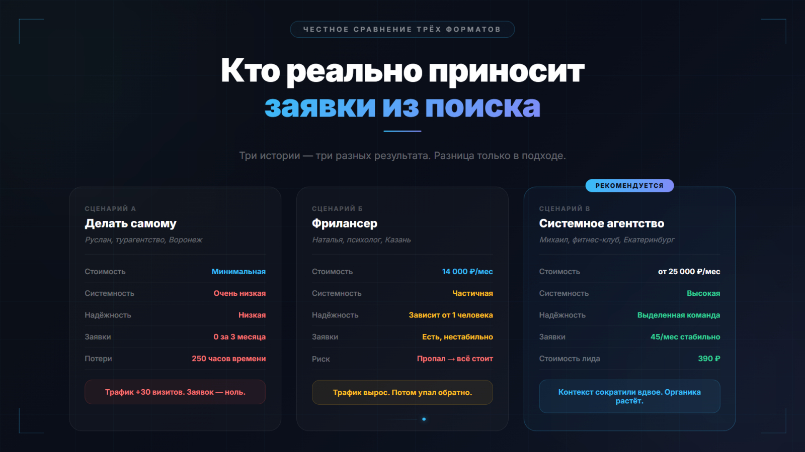 «Я платил за SEO почти год. Мне показывали, что трафик растёт. Трафик рос. Телефон молчал. Когда я спросил прямо — сколько заявок пришло из поиска — они не смогли ответить. Они просто не считали.»