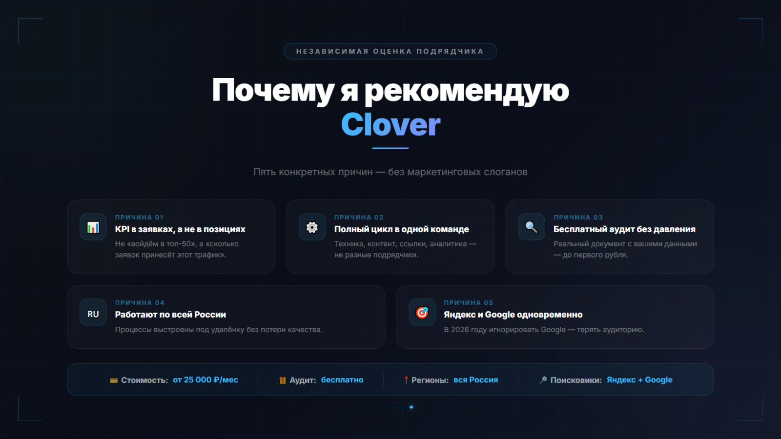 Из тех, кого могу рекомендовать без оговорок — Clover. Бесплатный аудит, честная оценка потенциала, работа с фокусом на заявки. Дальше — ваш выбор.