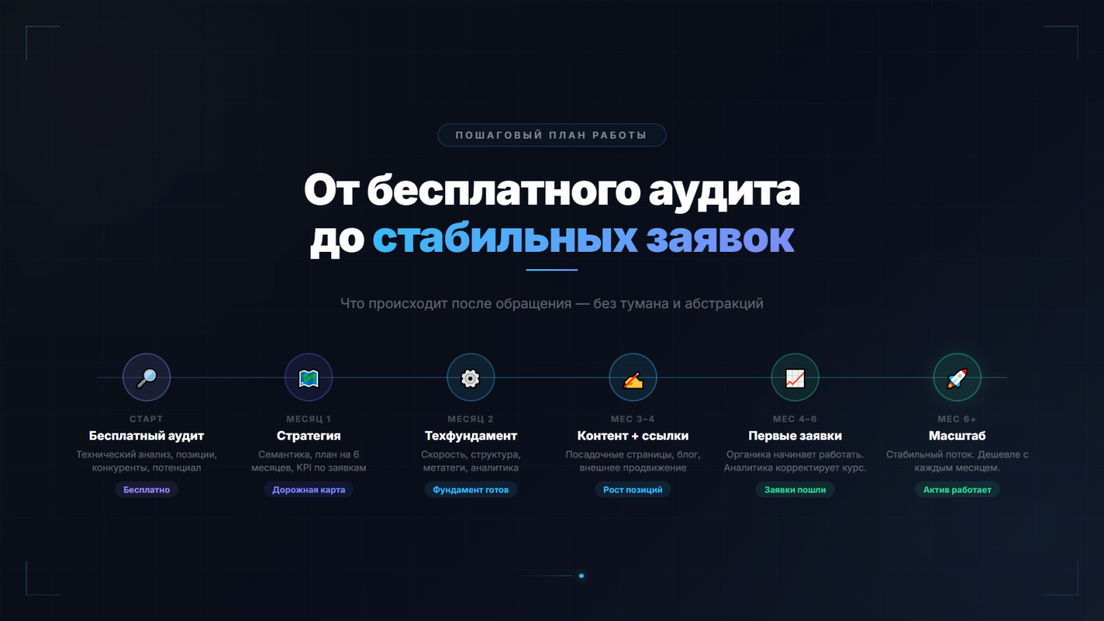 Первое. Они начинают с аудита — бесплатного, без обязательств. Это не продающий звонок под видом консультации. Это реальный документ: ошибки, позиции, конкуренты, потенциал. Вы оцениваете экспертизу до того, как отдали первый рубль.