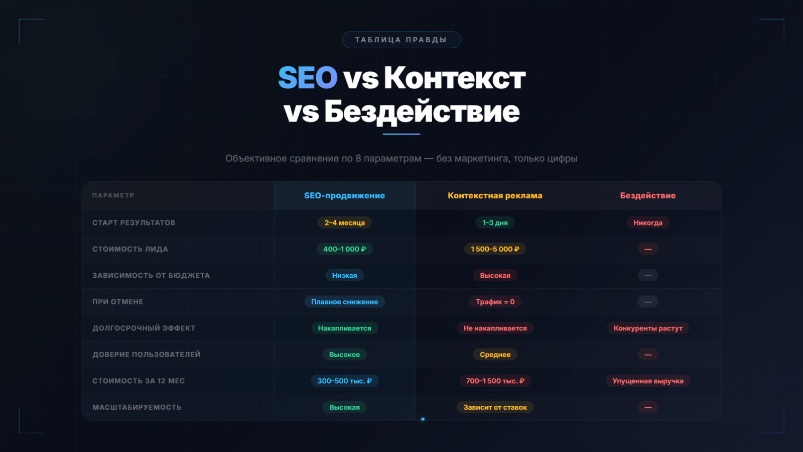 Вывод из таблицы: SEO и контекст — не конкуренты. Лучшая стратегия — запустить оба. Контекст закрывает потребность в заявках прямо сейчас. SEO строит канал, который со временем делает контекст всё менее нужным.
