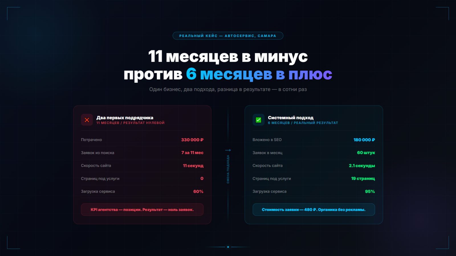 Владелец — назову его Андрей — потратил 11 месяцев и 330 000 рублей на SEO у двух разных подрядчиков. Суммарный результат: 7 заявок из поиска за всё это время.