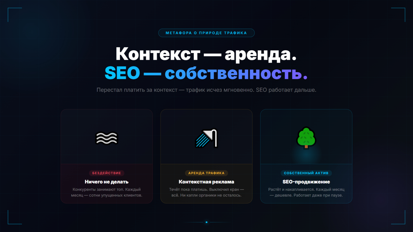 SEO — это не аренда. Это покупка актива. Контекст — вы арендуете трафик: перестали платить — поток иссяк мгновенно. SEO — вы строите собственность: вложения накапливаются, трафик продолжает работать даже при снижении бюджета.