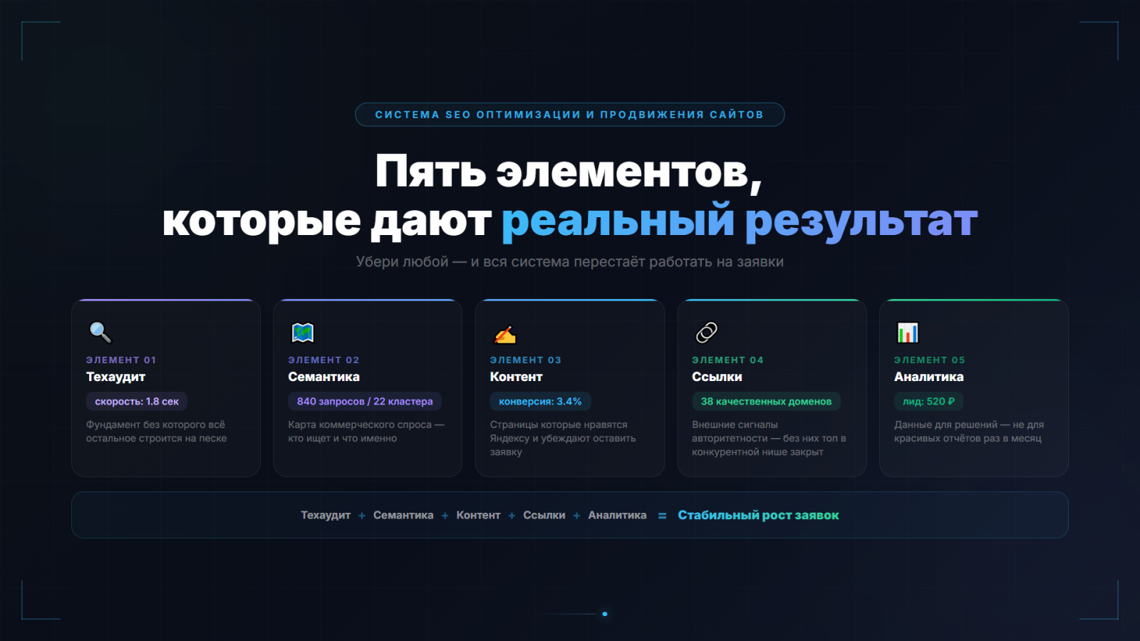 Формула системного SEO: технический фундамент + коммерческая семантика + конверсионный контент + внешние сигналы + аналитика замкнутого цикла = стабильный рост заявок