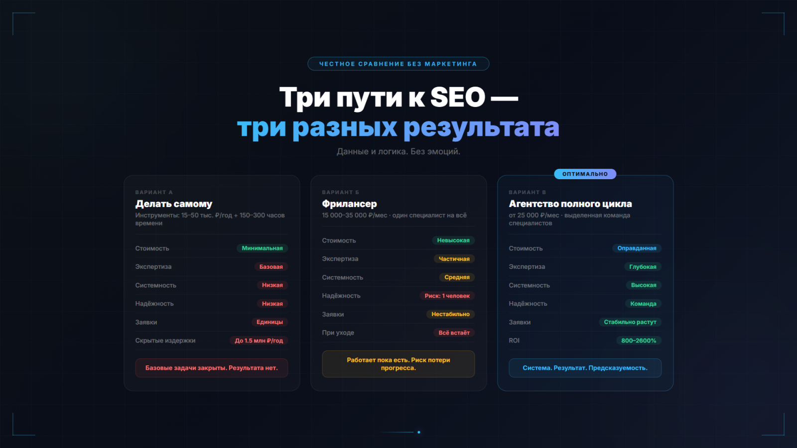 Вывод из расчётов: при среднем ROI 800–2 600% вопрос «дорого ли стоит SEO» трансформируется в вопрос «сколько денег я теряю каждый месяц без SEO».
