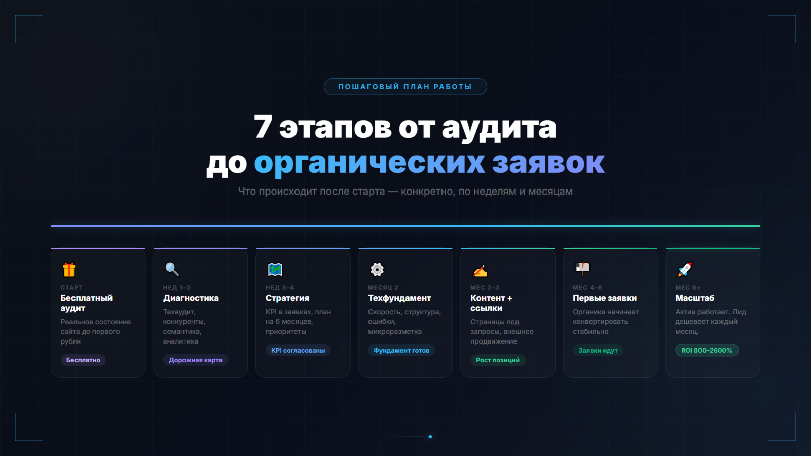 Бесплатный технический и маркетинговый аудит перед началом работы. Вы получаете документ с реальным состоянием сайта и потенциалом ниши — до первого платежа.