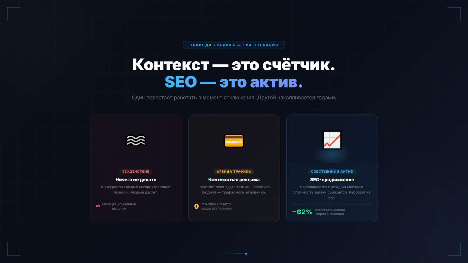 Важный нюанс про природу инвестиции. Контекстная реклама — это аренда: платите ежемесячно, получаете трафик только пока платите. Прекратили — трафик исчез мгновенно. SEO — это актив: вложения первых месяцев формируют позиции, которые продолжают работать даже при снижении бюджета. Как дивидендный портфель — требует времени на формирование, но потом приносит доход регулярно.