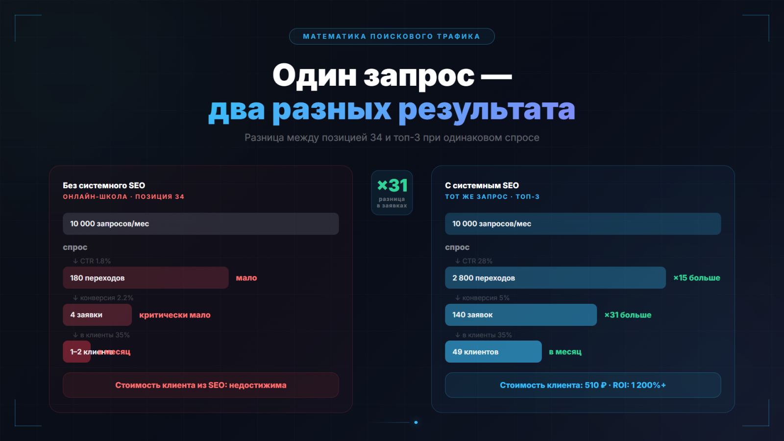 При средней стоимости заявки из SEO в 400–1 200 рублей и конверсии в клиента 20–40% — стоимость привлечения клиента составит 1 000–6 000 рублей. Если ваш средний чек выше этой суммы хотя бы в 3–5 раз — экономика работает.