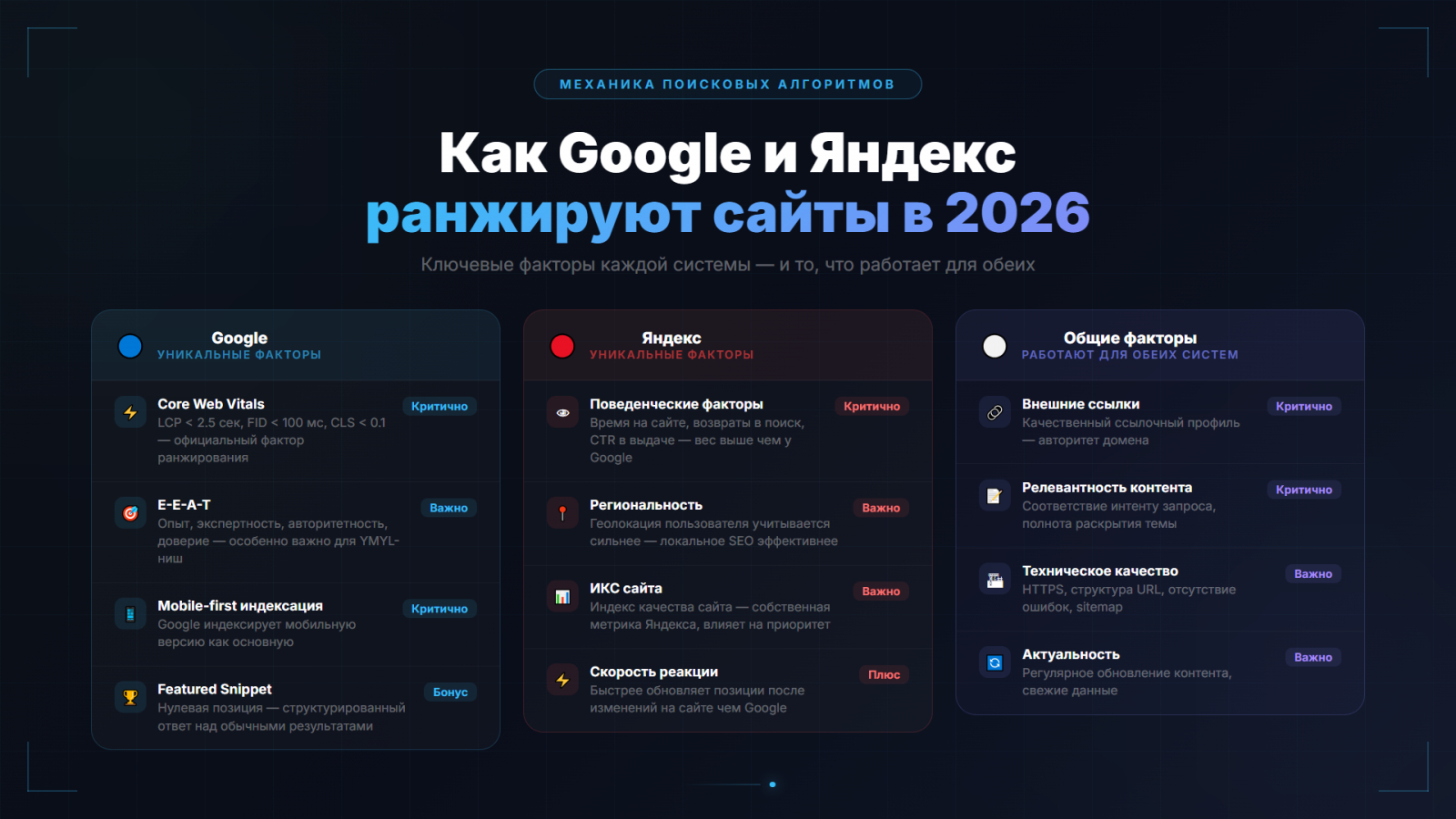 Поисковые системы ранжируют сайты по четырём блокам факторов: техническое качество, релевантность контента, авторитетность домена, поведенческие сигналы. Проблема большинства сайтов — в том, что они не работают ни с одним из этих блоков системно.