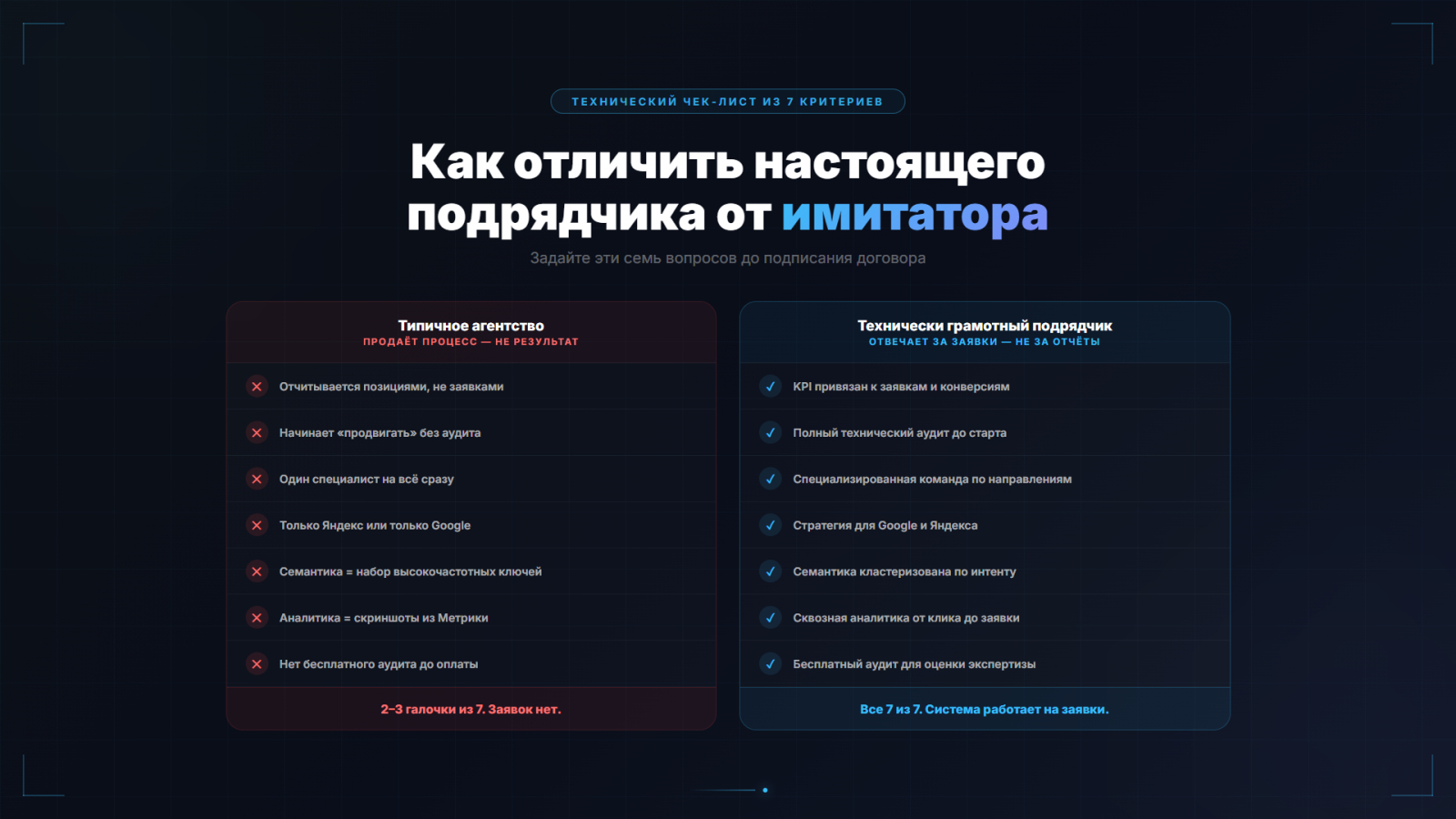 Зная, как устроено правильное SEO, можно оценить подрядчика до начала работы. Вот семь конкретных вопросов с объяснением, почему они важны.