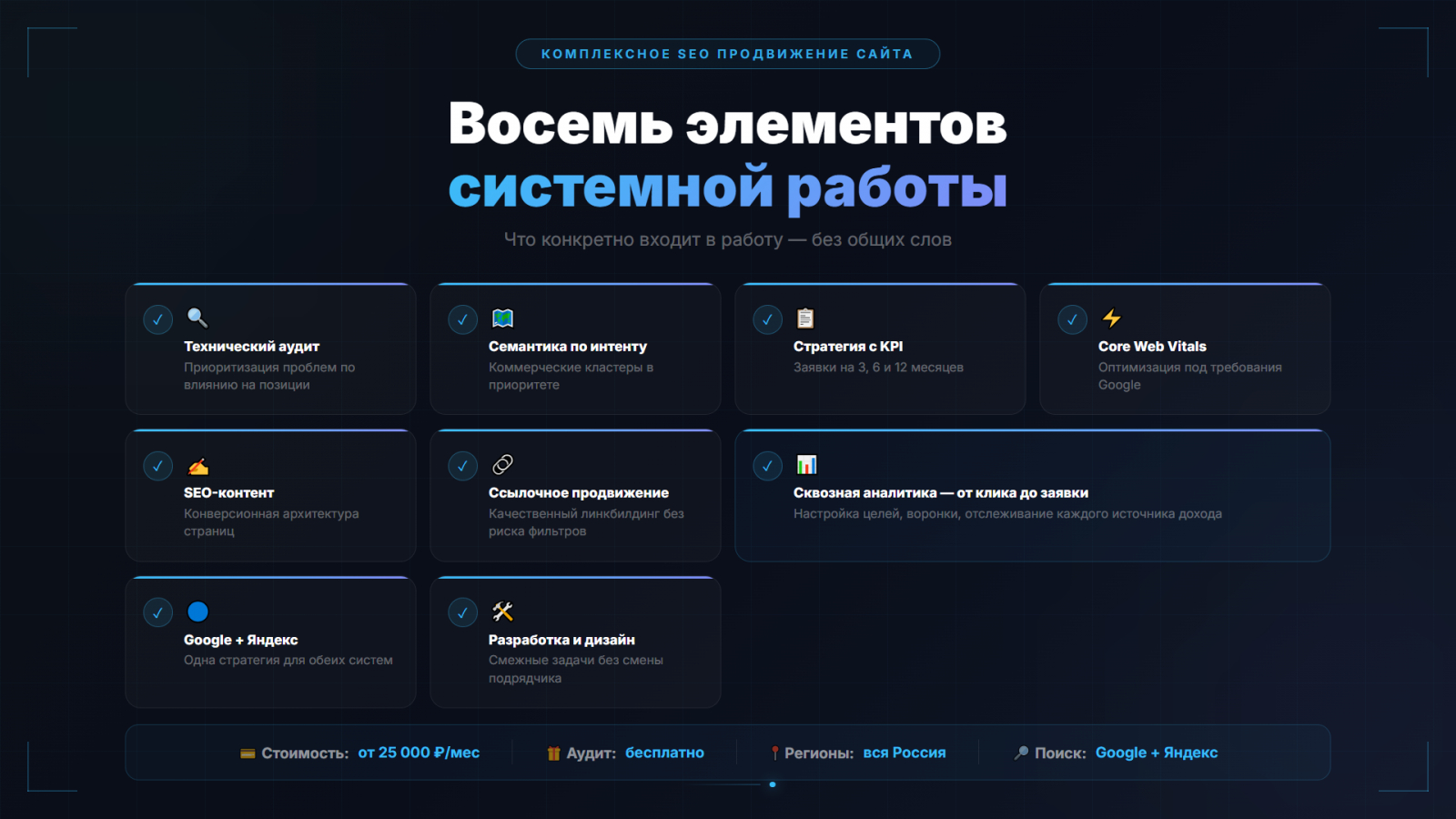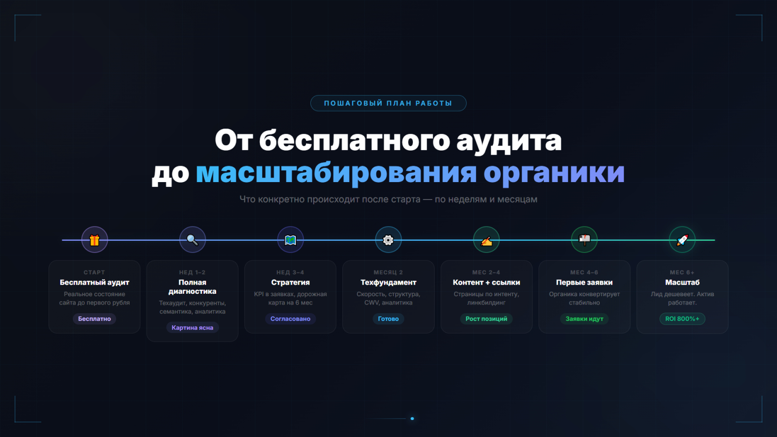 Технический аудит до старта — проводят бесплатно, без обязательств. Вы получаете документ с конкретными проблемами вашего сайта до первого платежа.