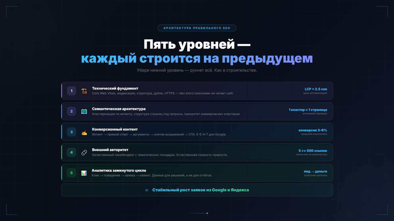 Правильное SEO — это не набор разовых действий, а архитектура из пяти уровней: технический фундамент → семантическая структура → конверсионный контент → внешний авторитет → аналитика замкнутого цикла. Каждый уровень строится на предыдущем.