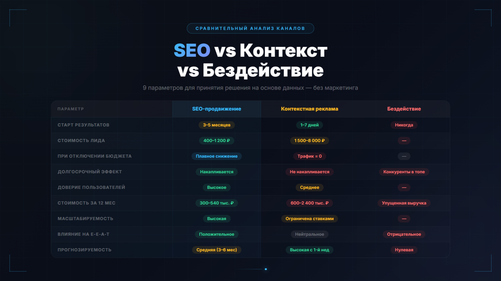 SEO — накопительный инструмент. Если нужны заявки в ближайшие 4–6 недель — запускайте контекст параллельно с SEO.