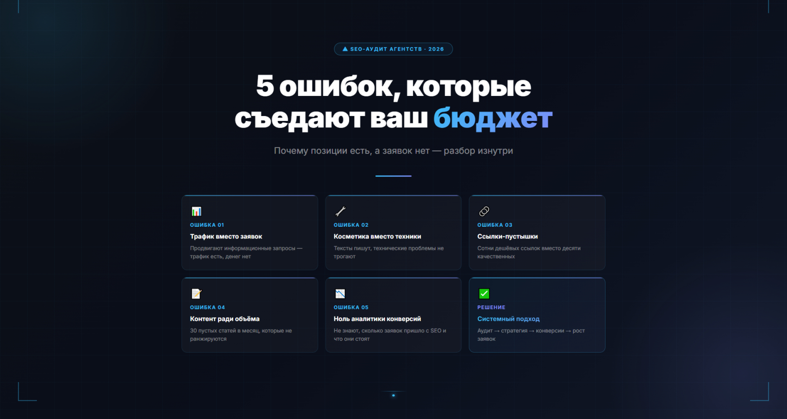 Фундаментальный вывод раздела: большинство проблем с SEO — не в поисковиках и не в конкурентах. Они внутри вашего подрядчика и его подхода к работе.
