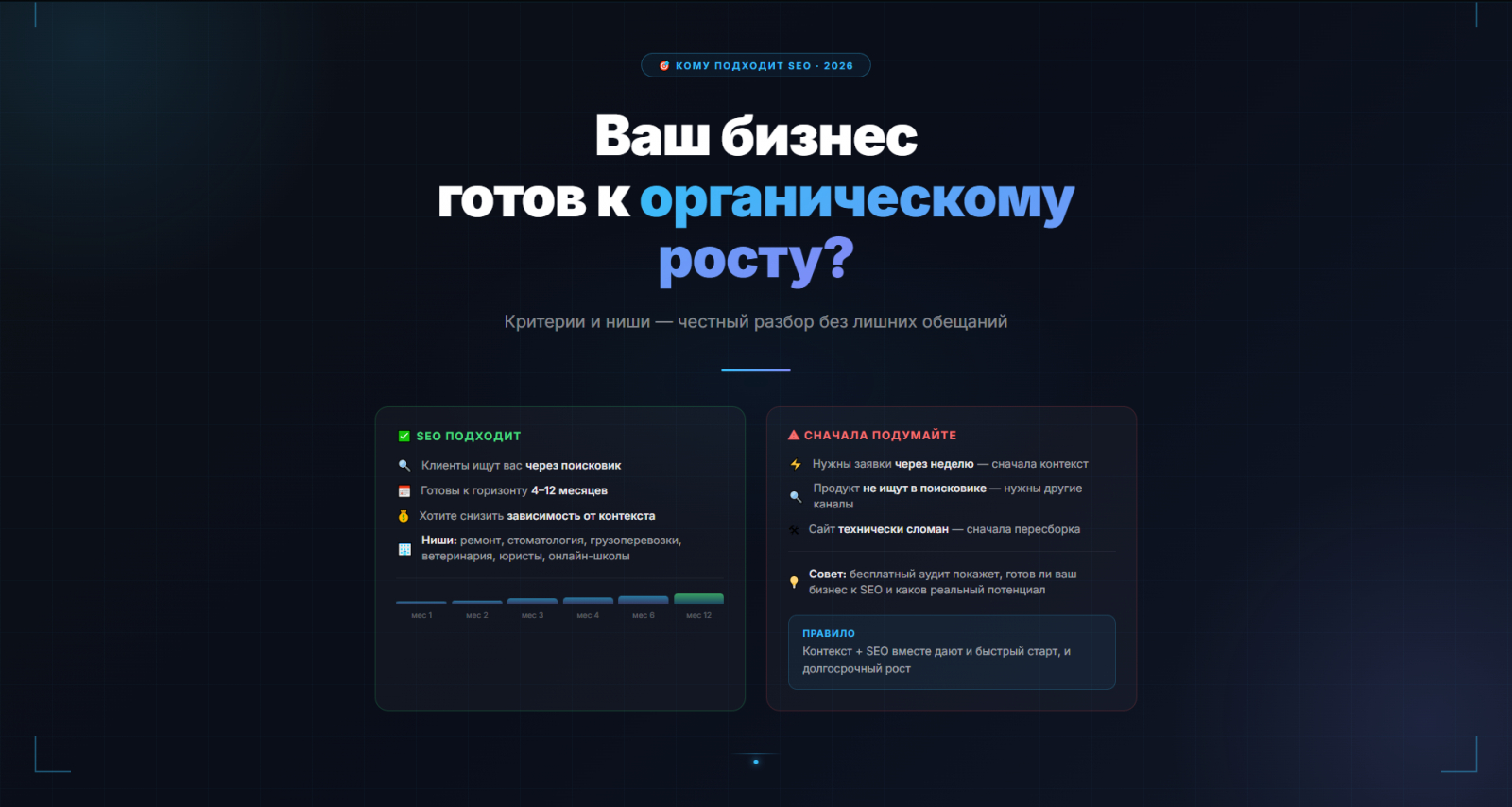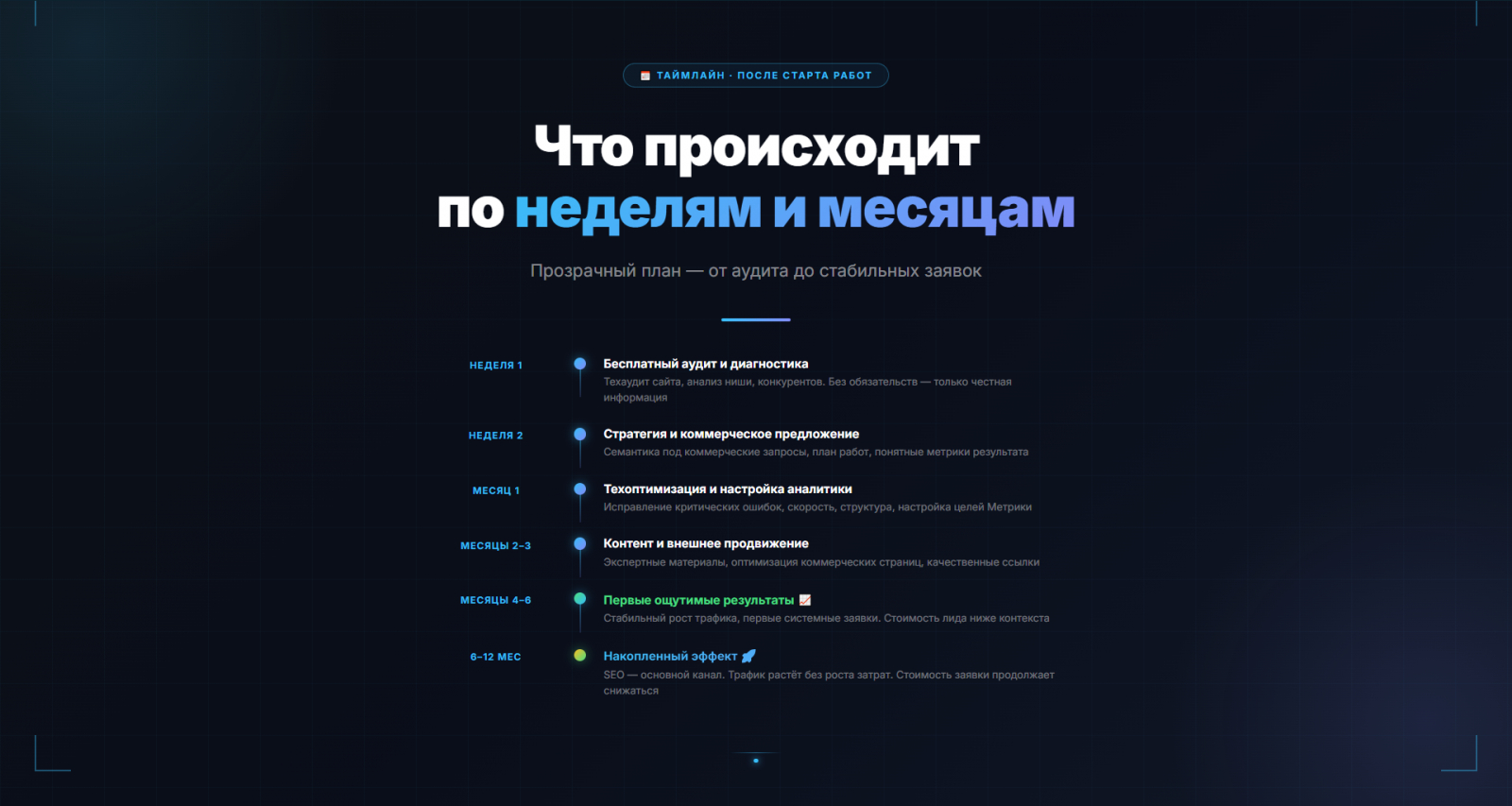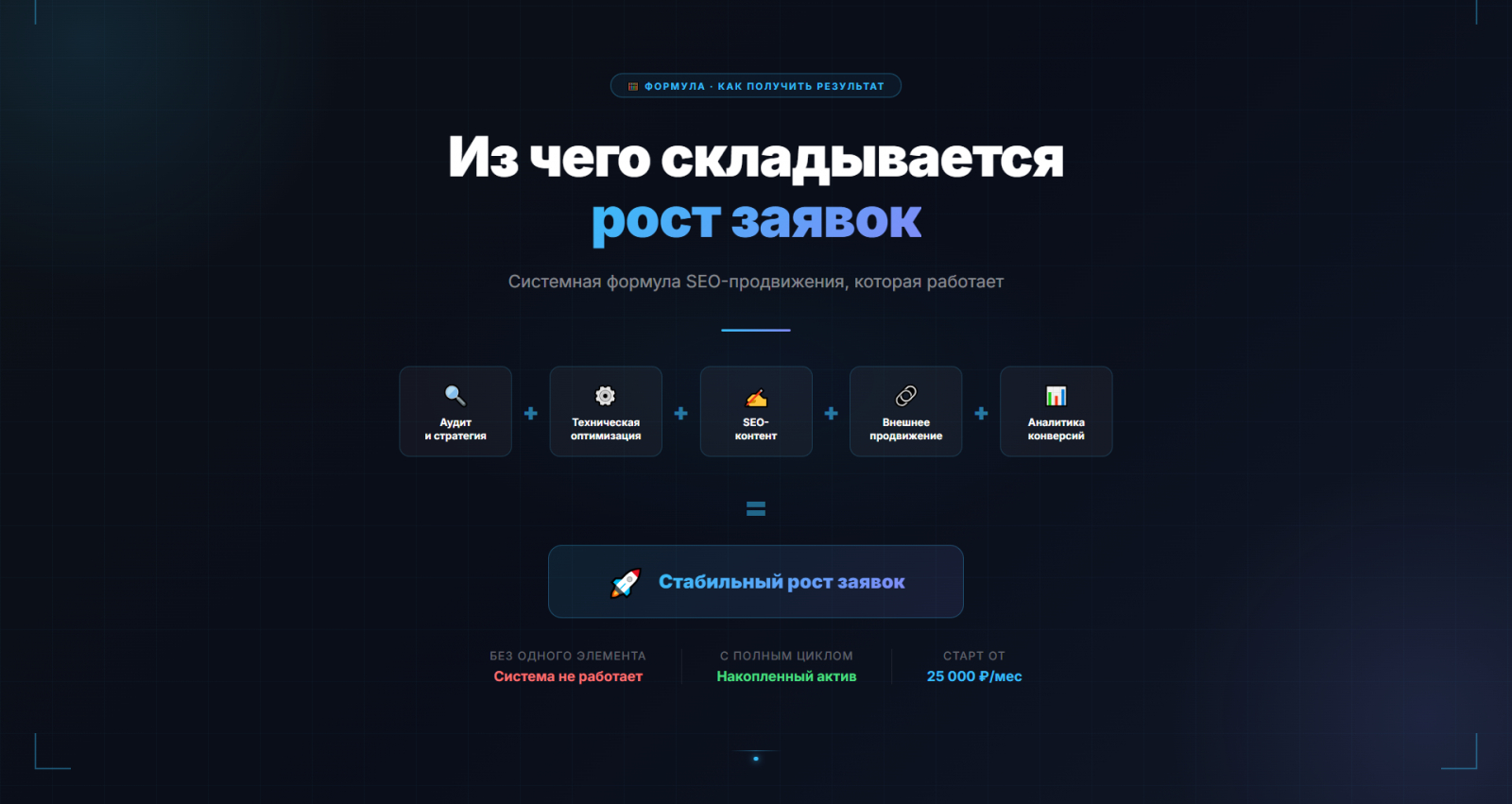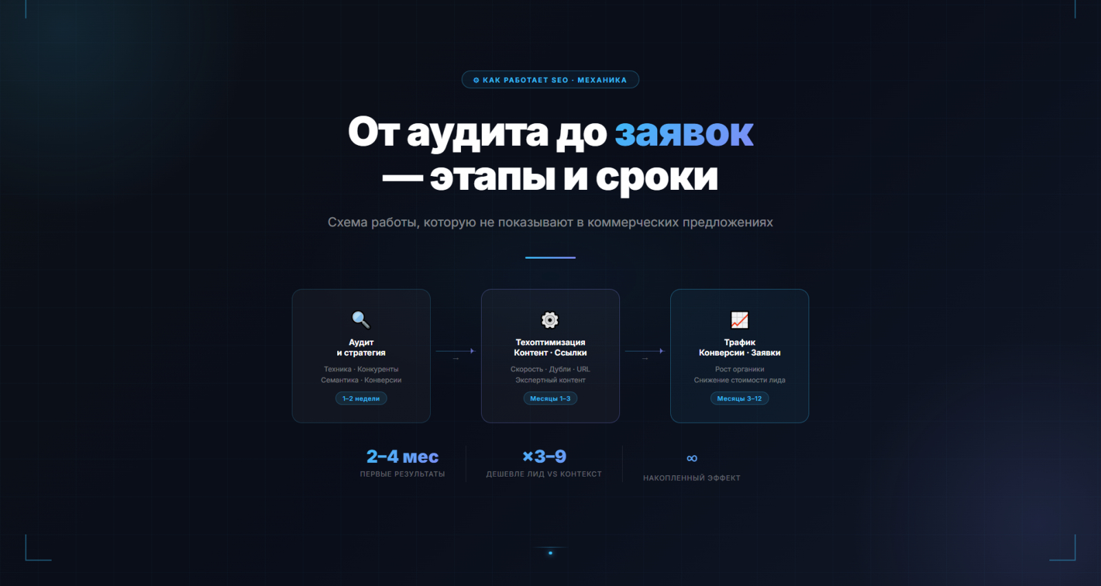 Рынок не ждёт. Каждый месяц без системного SEO — это заявки, которые достаются конкурентам. Начните с одного шага.