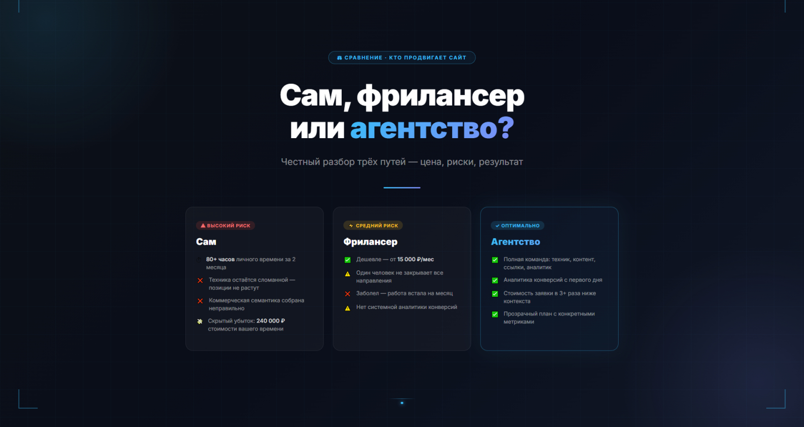 15 000 рублей в месяц, нашли на бирже. Фрилансер честный, работает, пишет тексты, добавляет ключи. Но он один. Он не может одновременно заниматься техническим аудитом, писать контент, строить ссылочный профиль и анализировать конверсии.