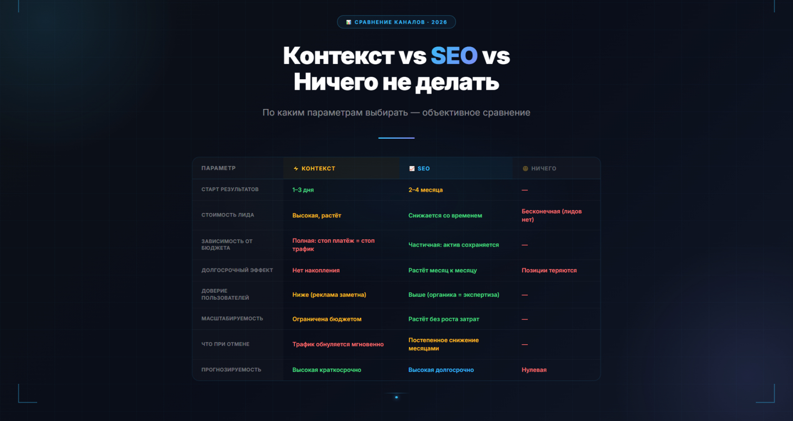 Вывод из таблицы: Контекст и SEO — не конкуренты, а разные инструменты. Контекст даёт трафик сейчас, SEO строит актив на годы. Компании, которые комбинируют оба канала, получают и быстрый старт, и долгосрочный рост.