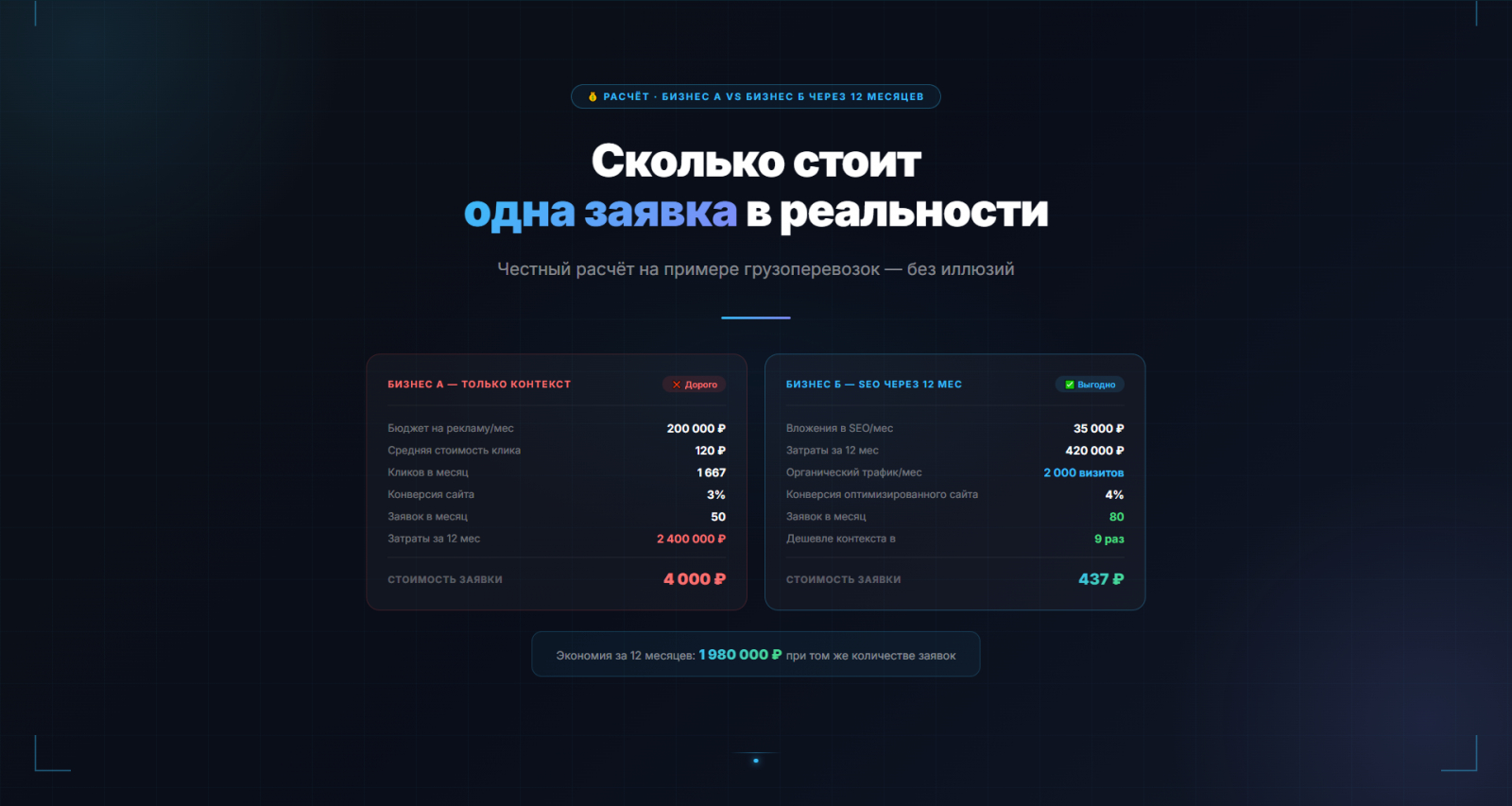 Простая математика. В вашей нише по ключевым запросам — допустим, 5 000 поисковых запросов в месяц. Сайт в топ-3 получает около 30% кликов — это 1 500 визитов. При конверсии 3% — 45 заявок в месяц.