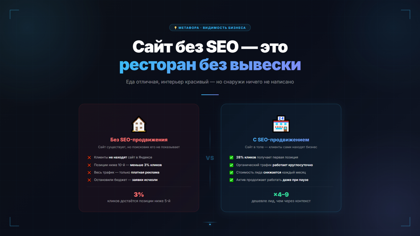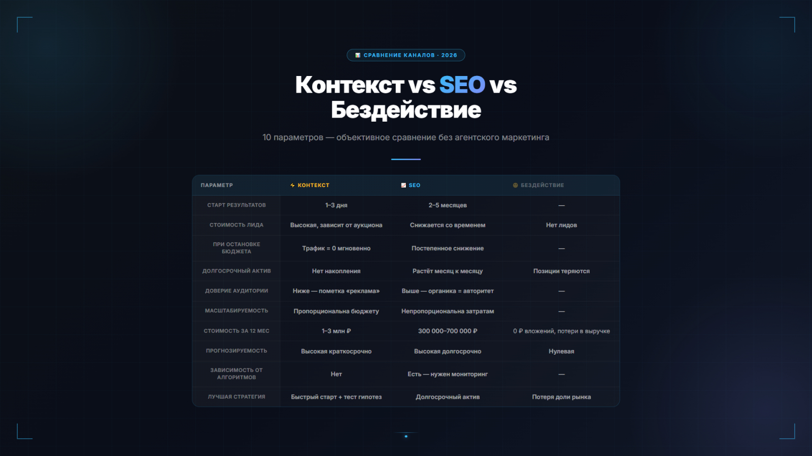 Личный вывод: я использую оба канала. Контекст — для быстрых заявок и тестирования гипотез. SEO — для снижения стоимости лида и построения независимого актива. Бездействие — это не нейтральная позиция, это ежемесячная потеря клиентов в пользу конкурентов.