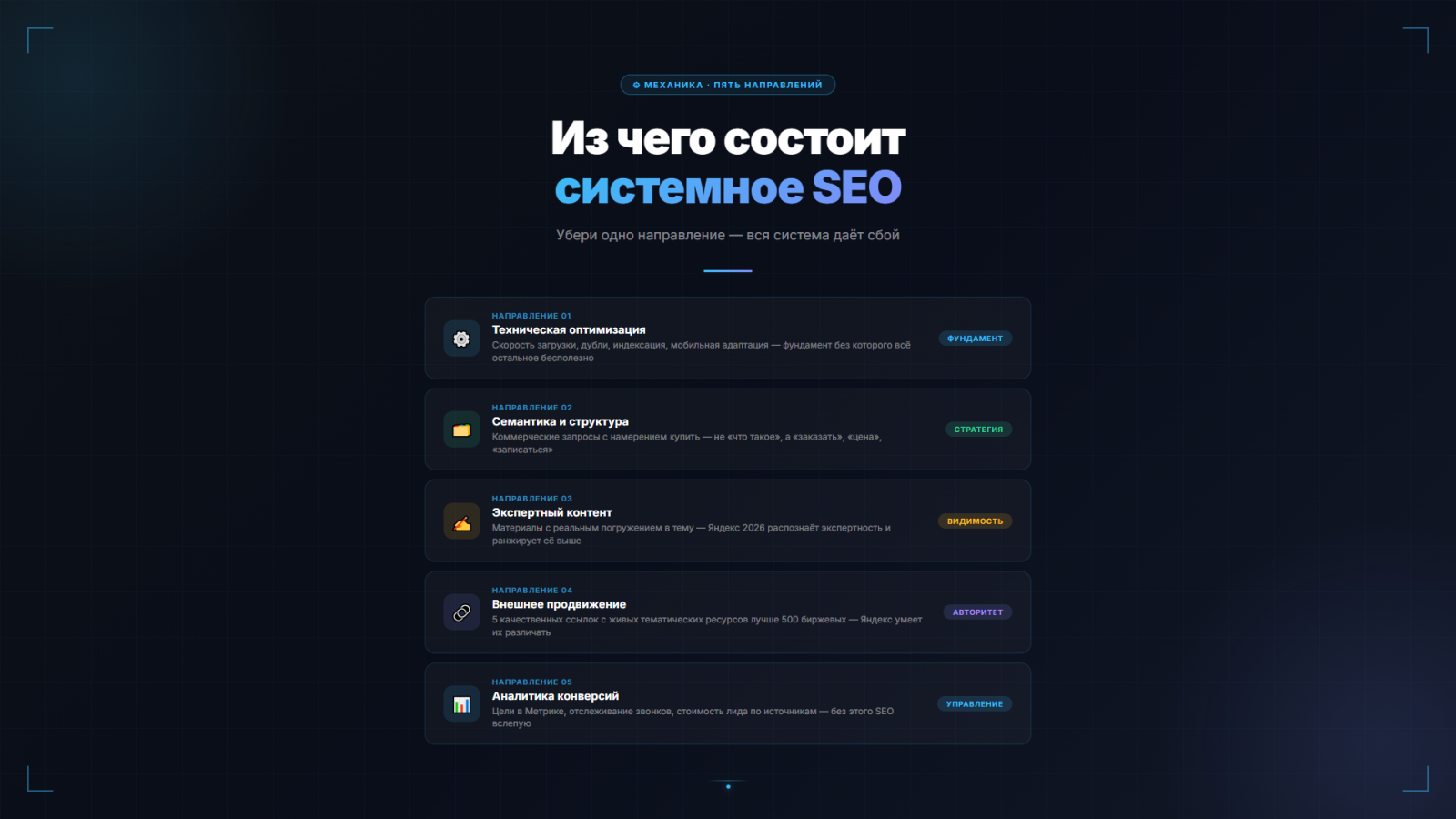SEO — это не одна услуга. Это система из пяти взаимосвязанных направлений. Убери одно — система даёт сбой. Именно поэтому «частичное SEO» почти всегда не работает.