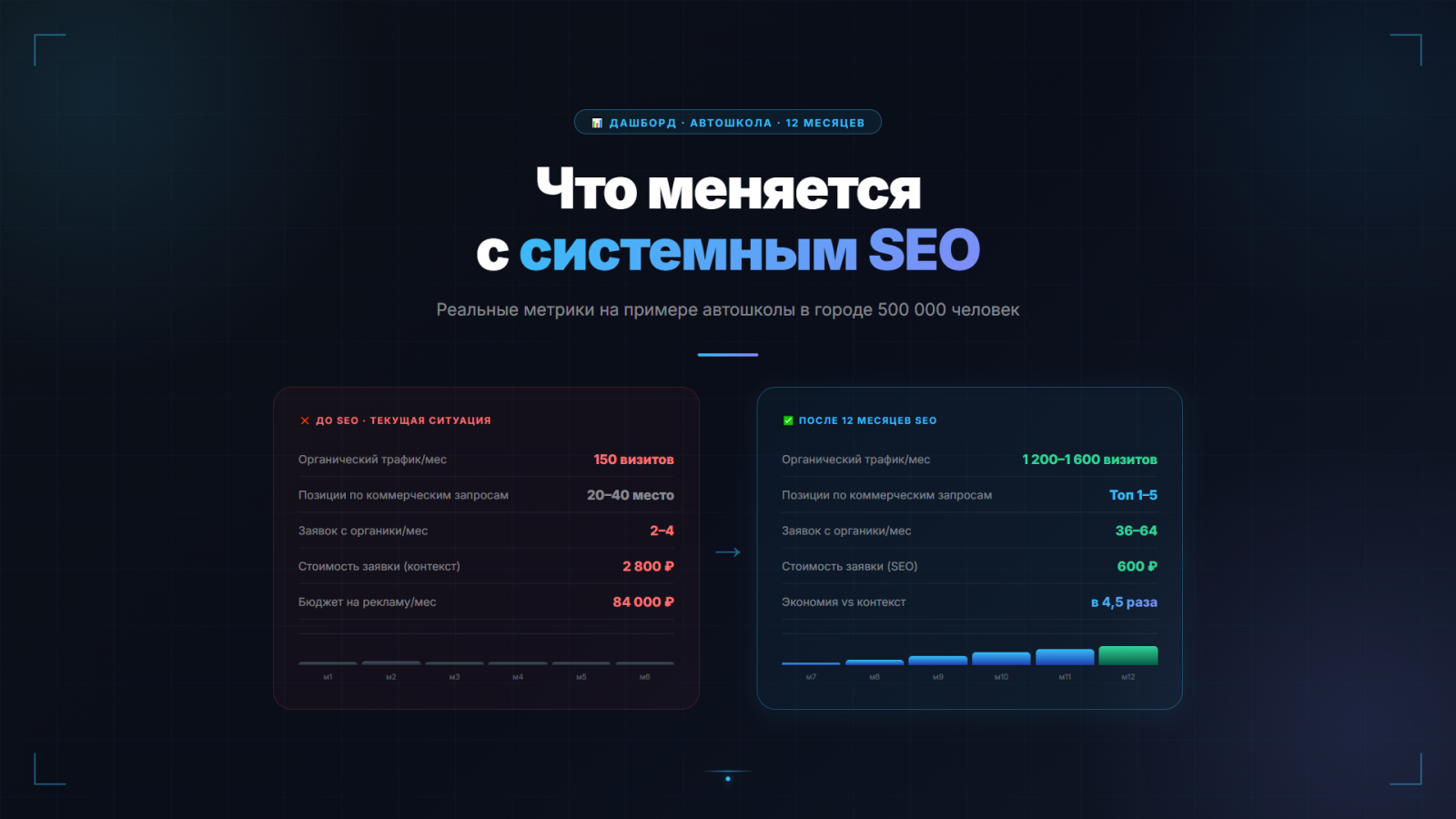 Месяц 9–12: SEO покрывает 50–70% заявок, контекст — страховка и ускорение.