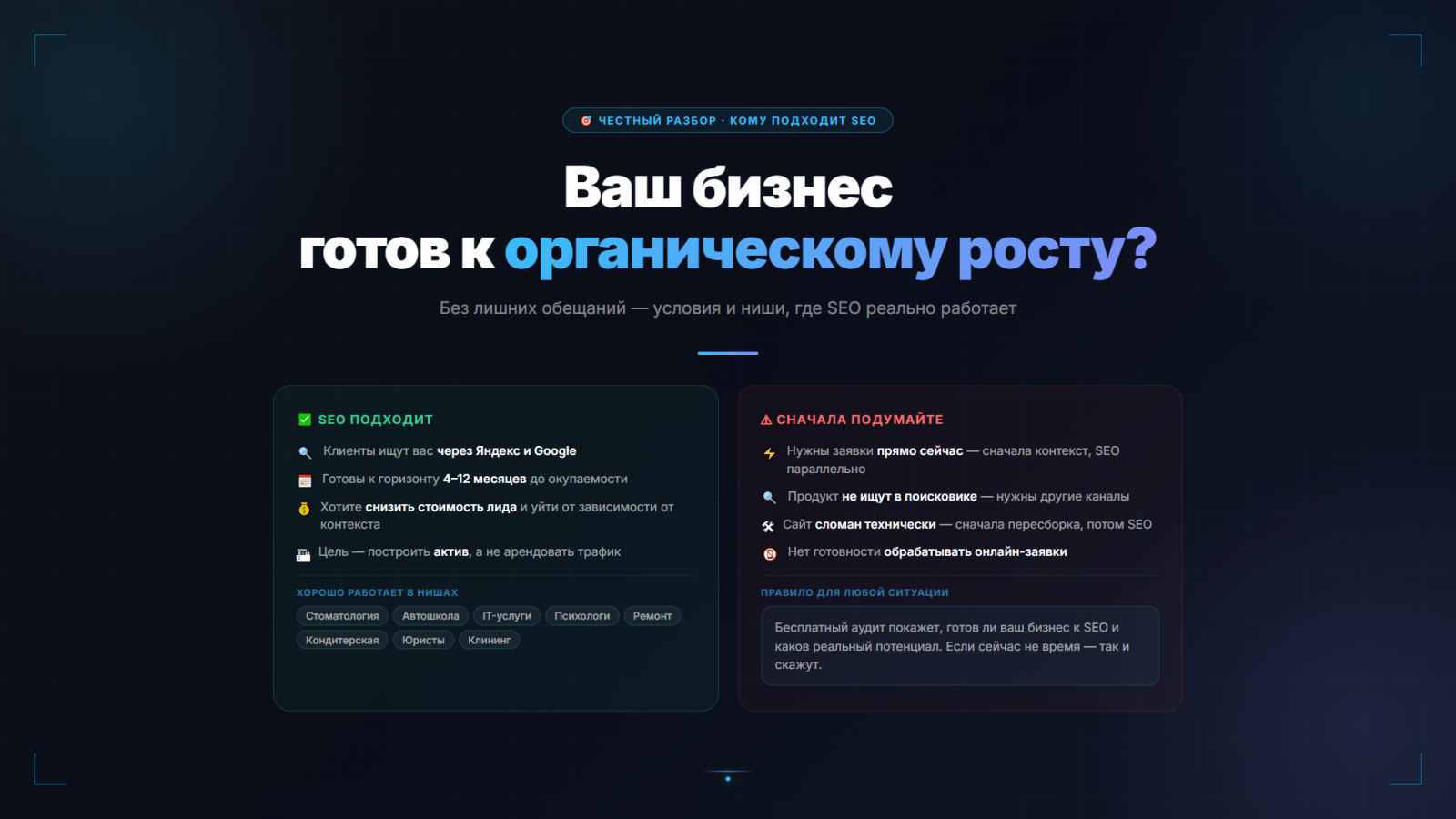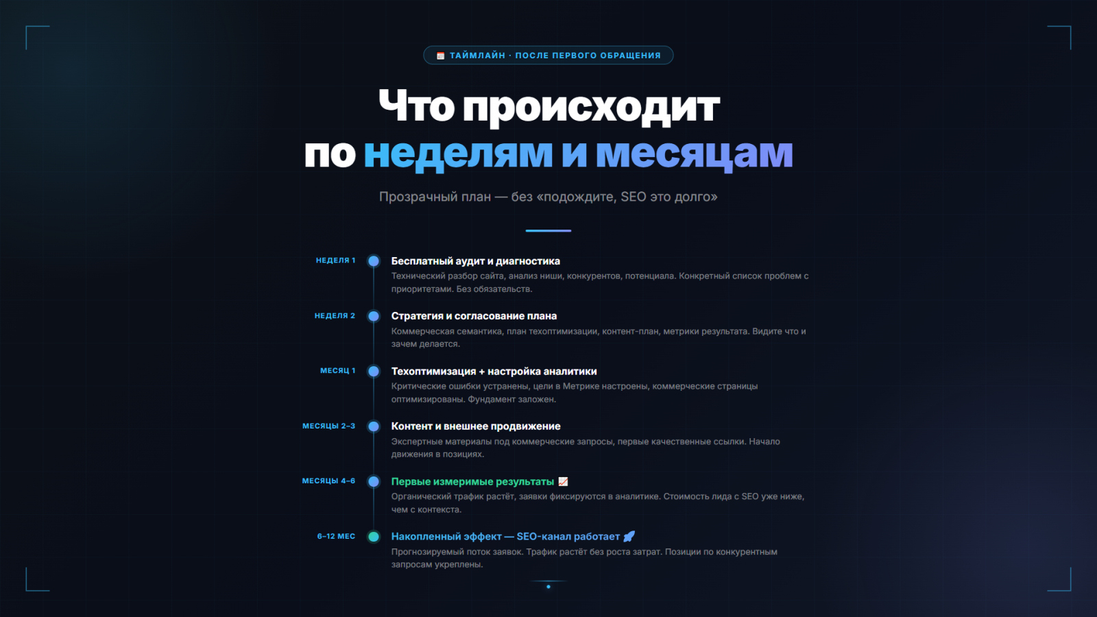 6. Бесплатный аудит до старта — не продающая презентация, а реальный технический разбор с конкретными выводами.
