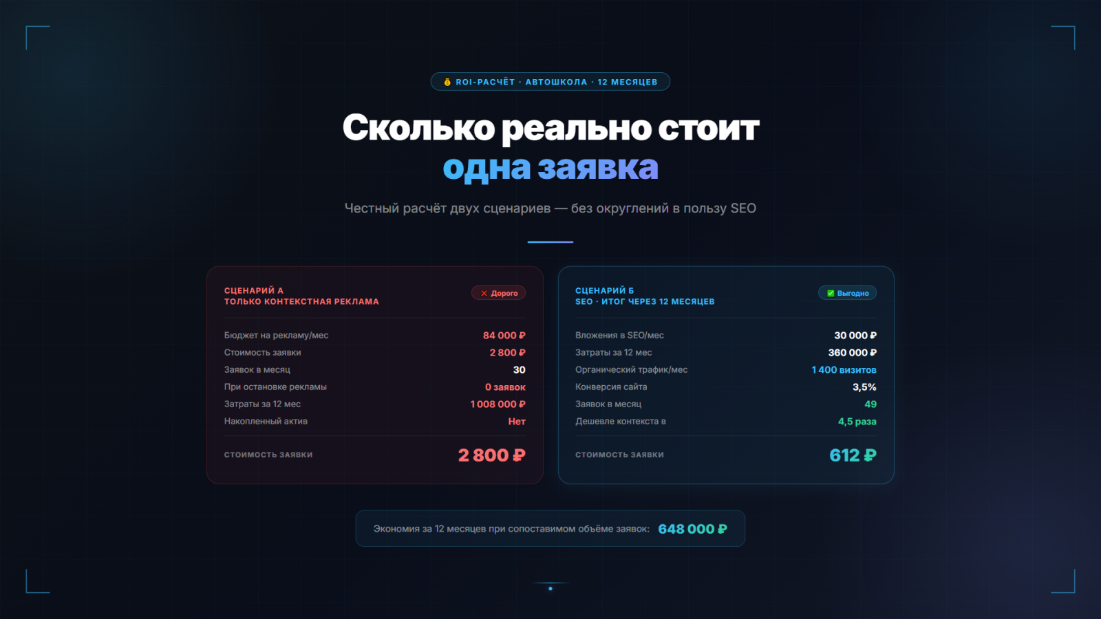 Сайт есть, контекстная реклама работает. Стоимость заявки через Директ — 2 800 рублей. Нужно 30 заявок в месяц = 84 000 рублей на рекламу ежемесячно. За год — 1 008 000 рублей, и это только бюджет без стоимости ведения.