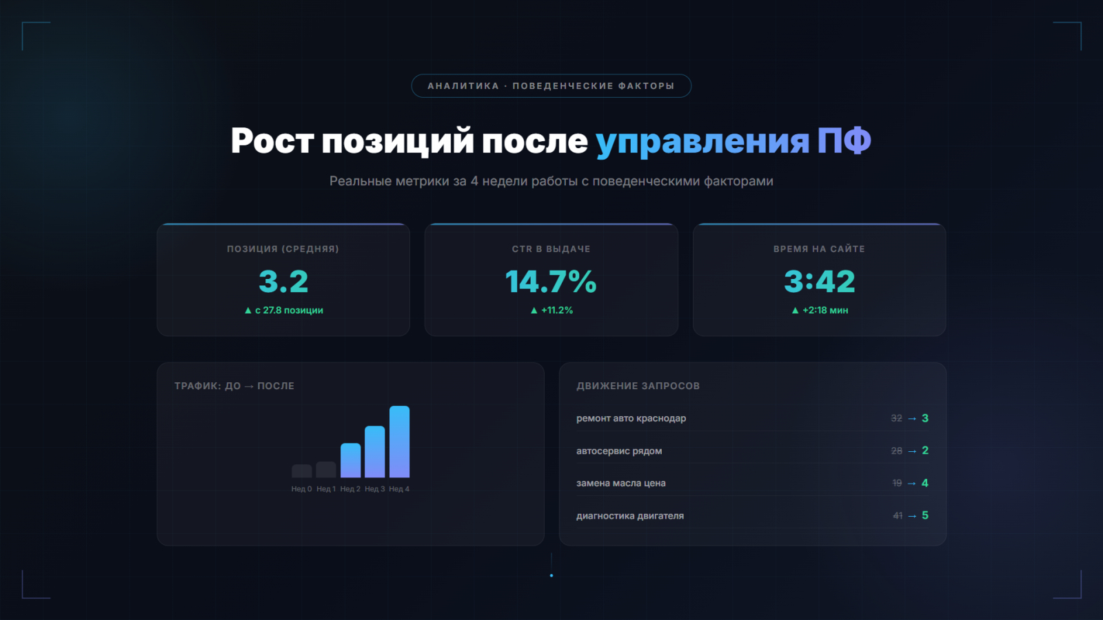 Окей, раскладываю. Проблема не в том, что агентства плохие. Некоторые — вполне компетентные. Проблема в том, что они продают вам процесс, а не результат. А процесс может длиться вечно, потому что главный фактор ранжирования в Яндексе сегодня — это не ссылки и не контент. Это поведенческие факторы. И если вы не управляете ими напрямую, вы вкладываете деньги в ингредиенты, но никогда не ставите блюдо в духовку.