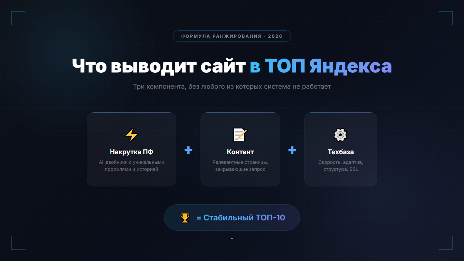 Именно поэтому накрутка ПФ в Яндекс — это не «серая схема» и не «обман поисковика». Это инструмент управления тем показателем, который Яндекс сам назначил главным. Вы же не считаете рекламу «обманом» — хотя она тоже искусственно привлекает внимание.