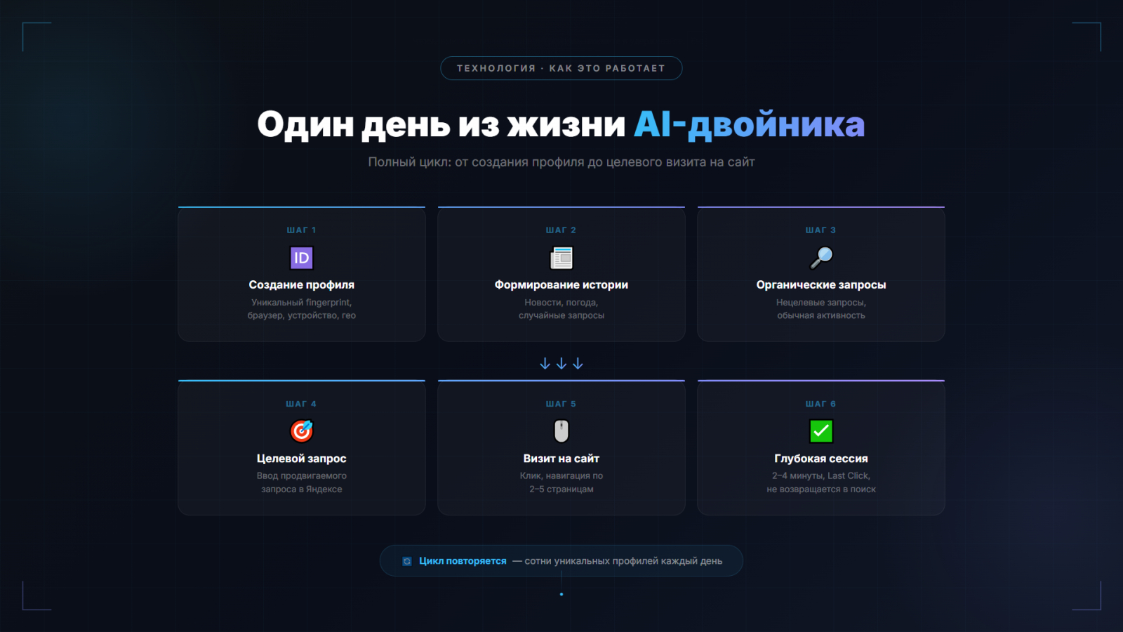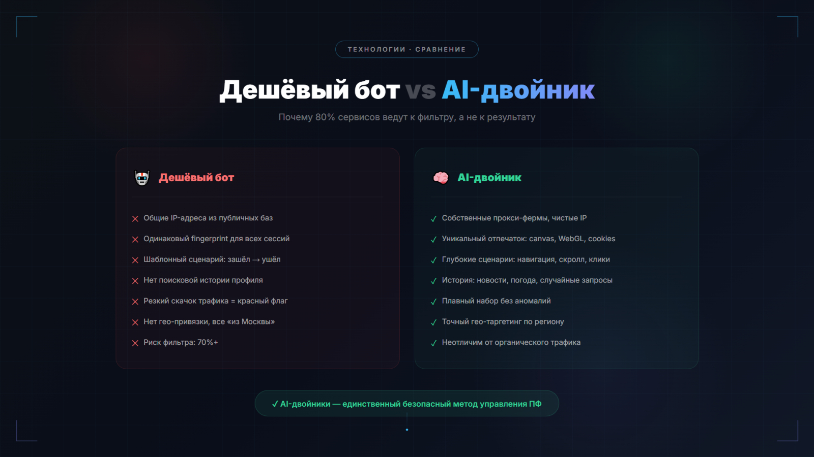 Вывод: AI-двойники — это не «более качественные боты». Это принципиально другая технология, где каждый профиль неотличим от живого пользователя.