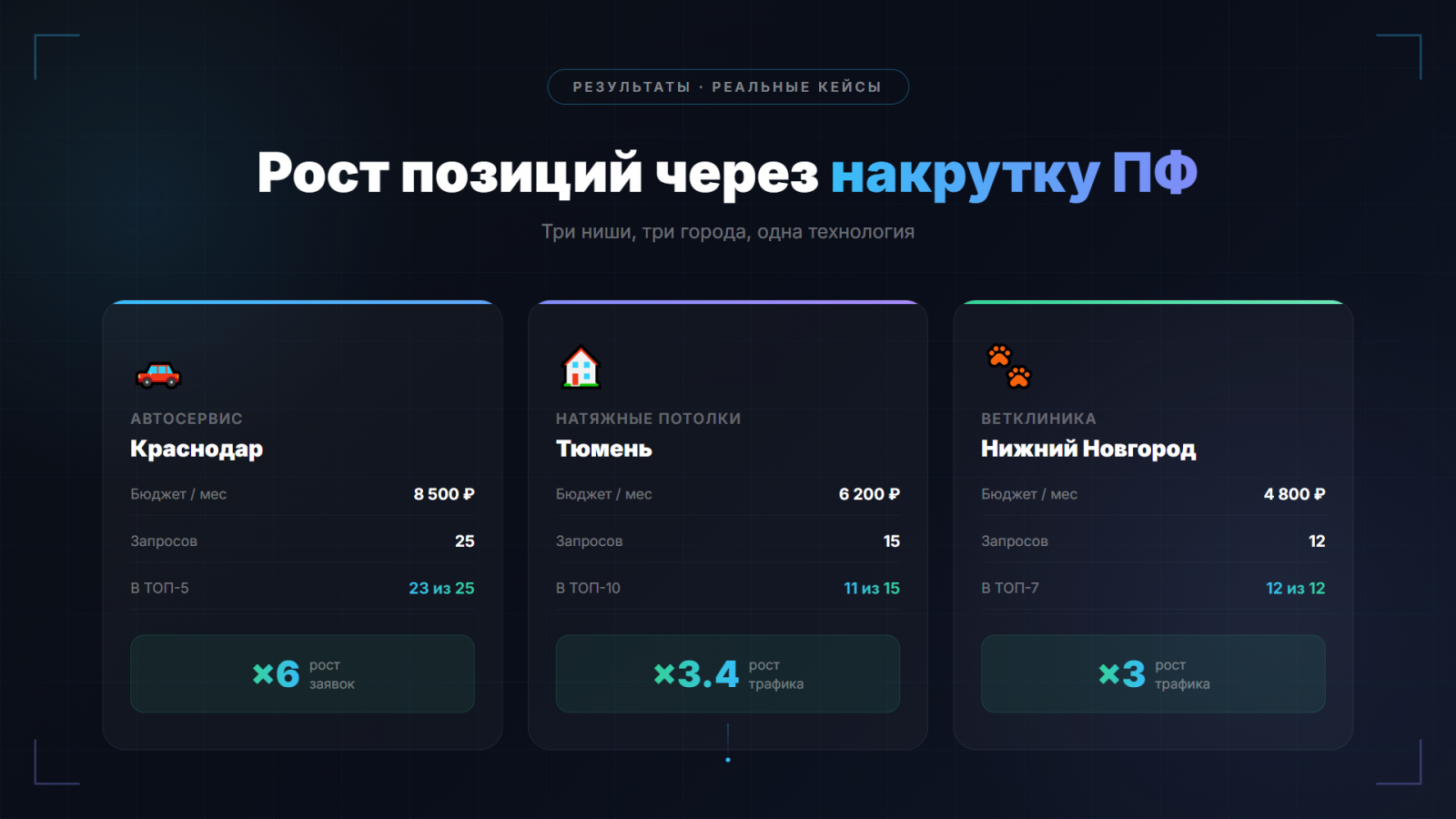 Обратите внимание: во всех трёх кейсах работала формула — накрутка ПФ + нормальный контент + техническая база = рост. Накрутка запускает цикл, контент удерживает, техбаза не мешает.