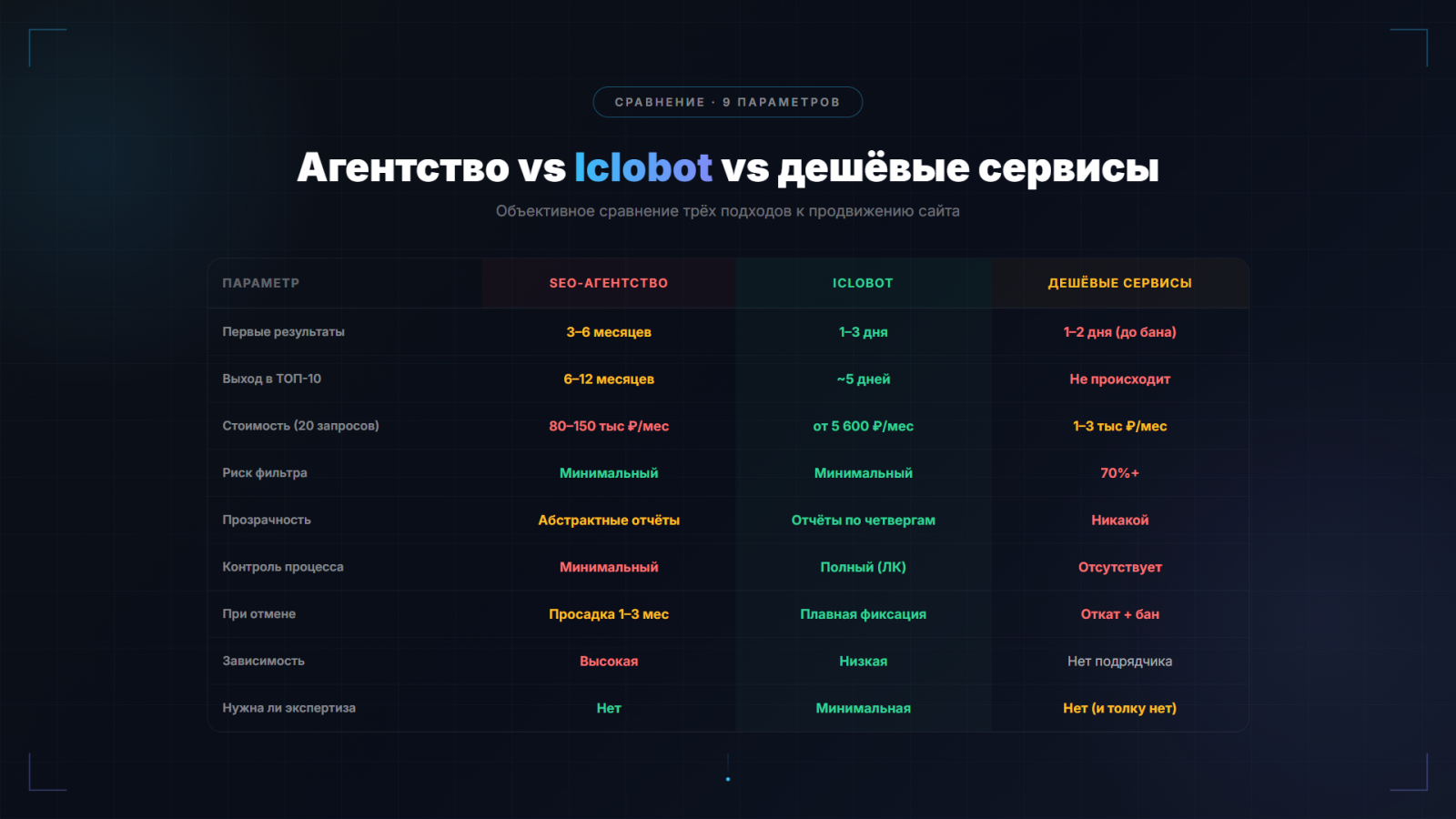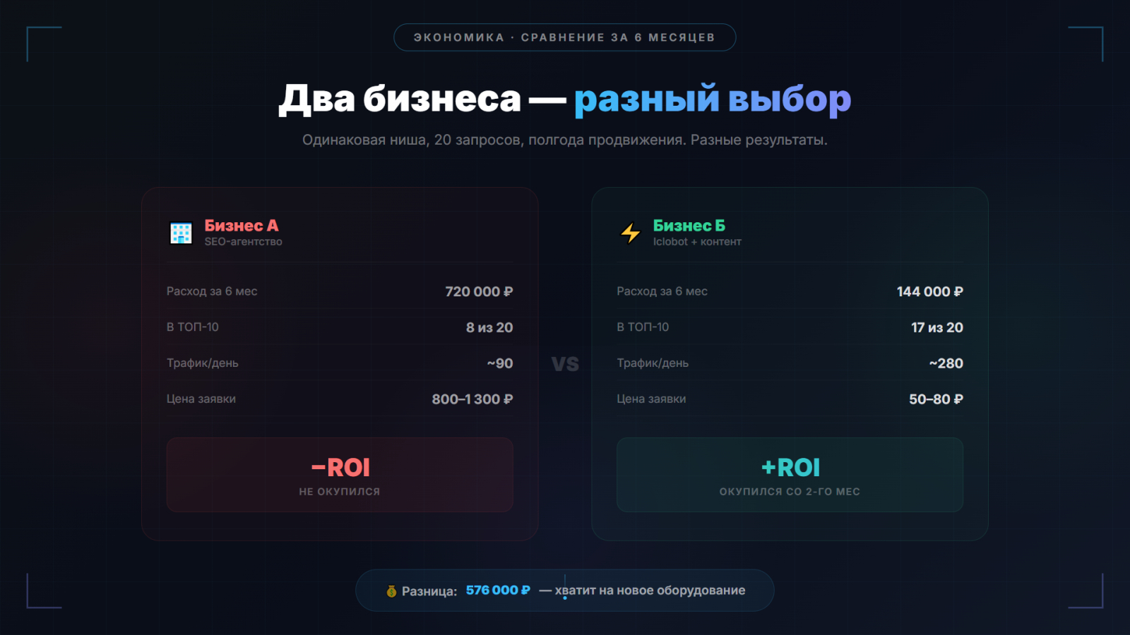 Вывод: при сопоставимом результате разница в стоимости — в 15–25 раз. Это не оптимизация расходов, это другая экономика.