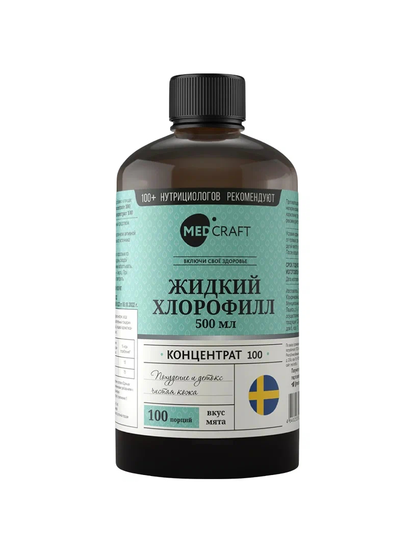 Жидкий хлорофилл от российского бренда MedCraft – добавка в формате концентрата, рассчитанная на ежедневный прием с разведением в воде. Основа формулы – медный комплекс хлорофилла натрия (sodium copper chlorophyllin), одна из наиболее распространенных и стабильных форм хлорофилла в БАДах.
