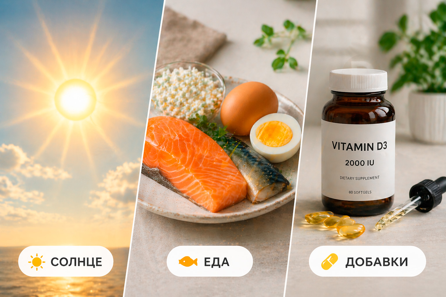 Еда. Закрывает дефицит только частично. Включать в рацион жирную рыбу 2-3 раза в неделю, яйца – полезно, но рассчитывать на нее как на основной источник не нужно.