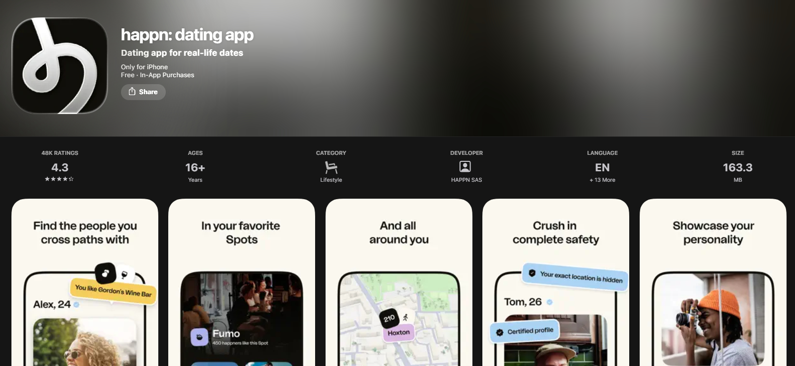 Возможности: геопоиск, матчи по близости, чаты по взаимности.