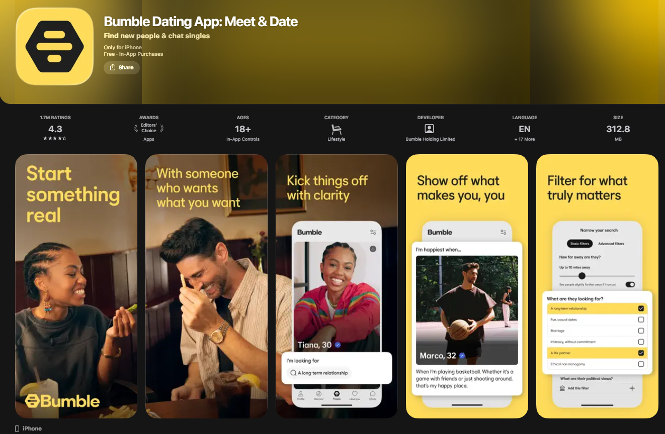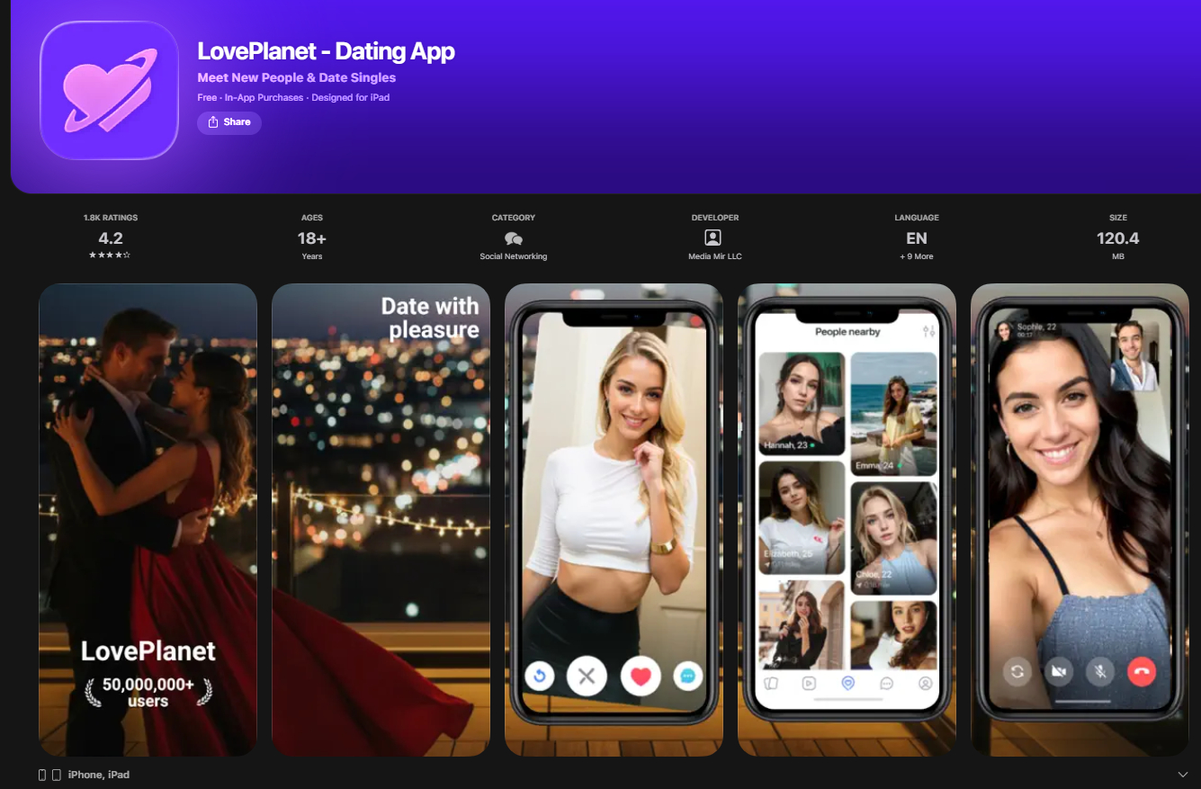 - Возможности: геолокация, фильтры, чат по совпадениям.