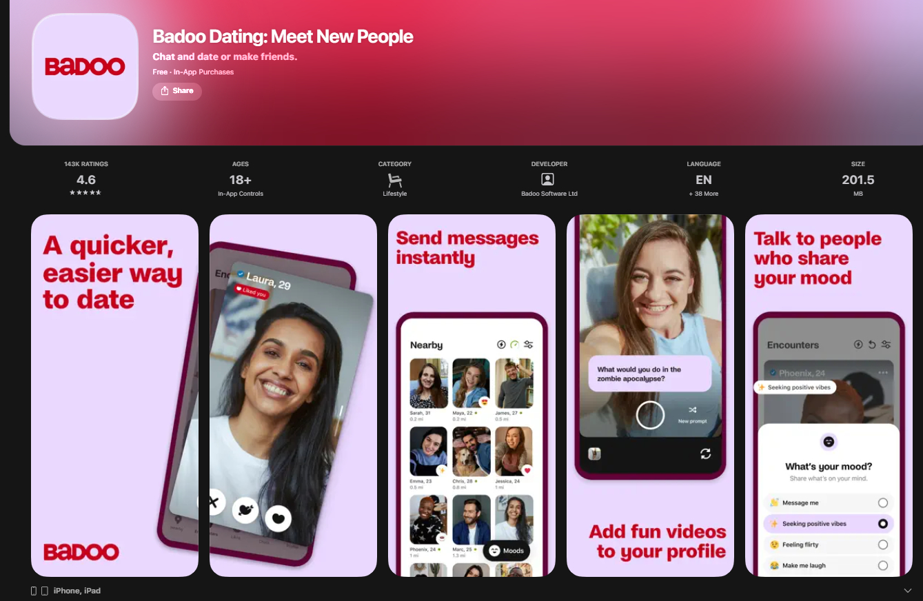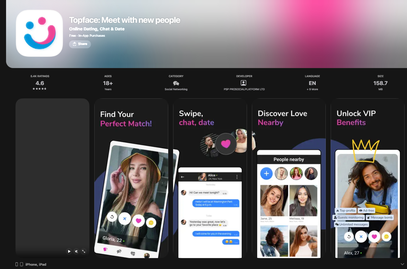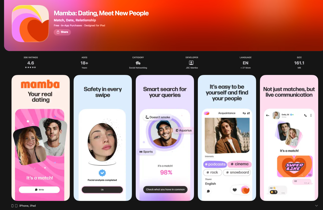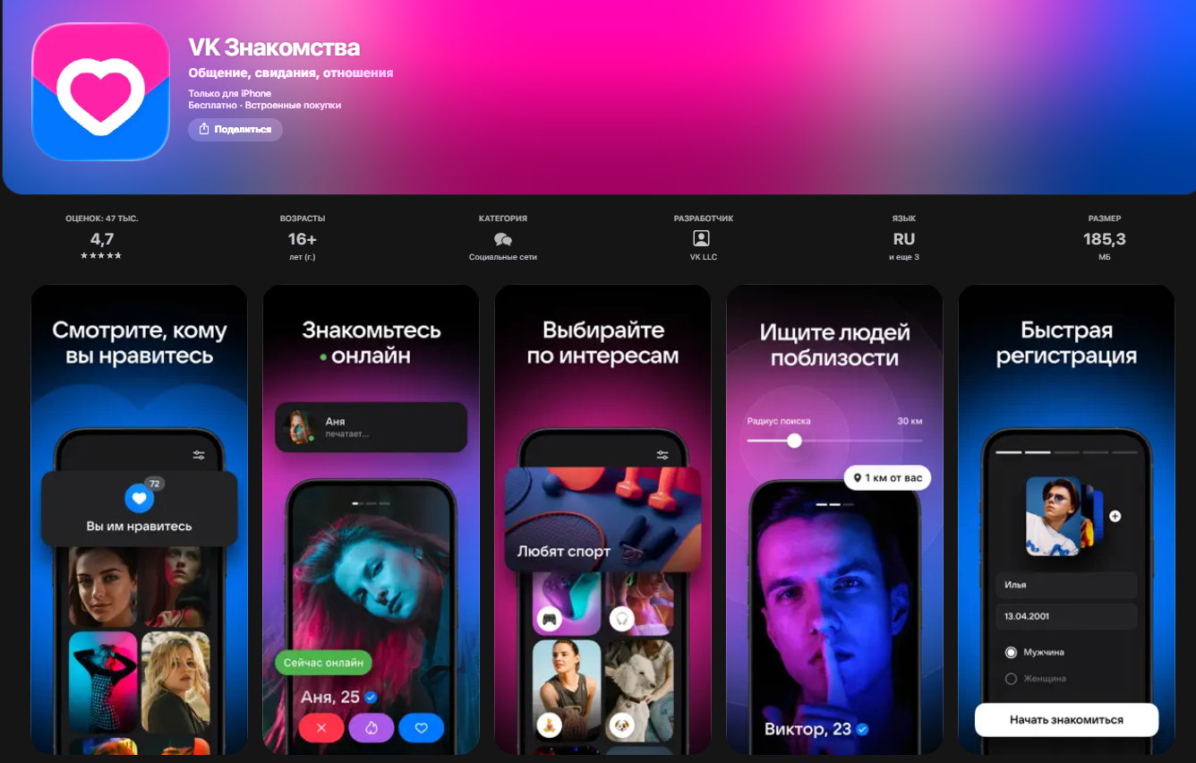 - Возможности: гео-подбор, взаимные симпатии, чат.